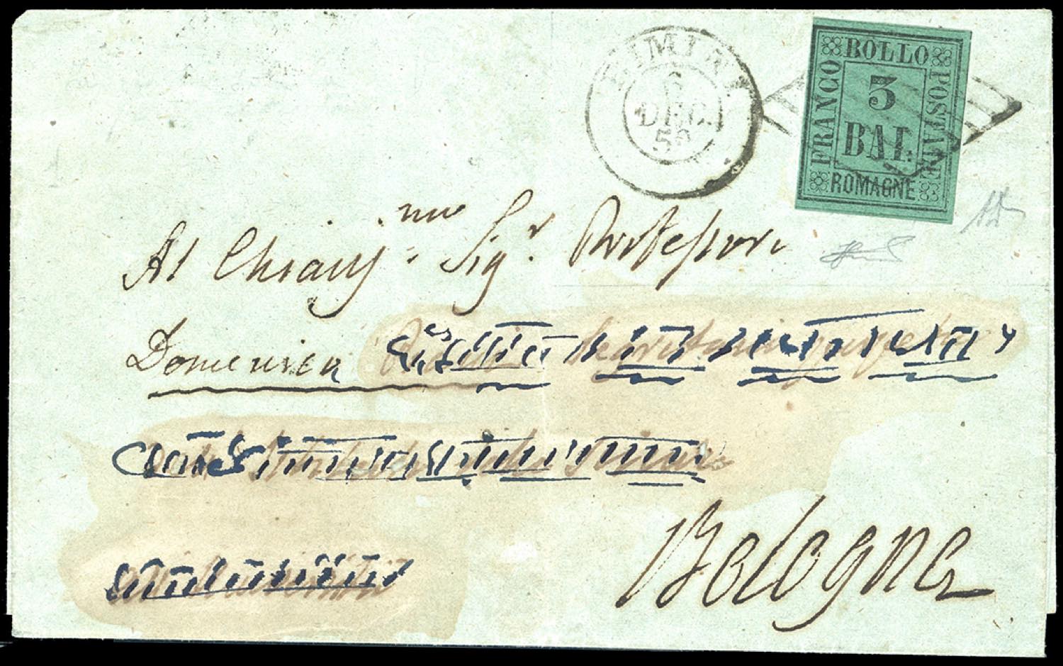 1859 - 3 baj verde scuro (4), perfetto, su lettera da Rimini 6/12/1859 a Bologna. Ferrario, cert. A.Diena.