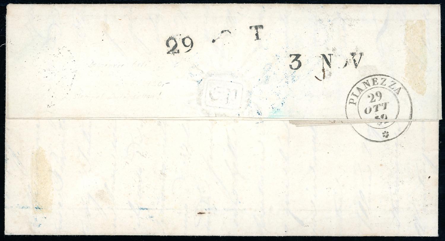 1852 - 20 cent. azzurro (2), bordo di foglio in basso, perfetto, ampi margini, annullato con muto a rombi, da Oulx 28/10/1852 (punti 12), a Torino, da qui rispedita a Piacenza, dove il 29/10, come da bollo al verso, venne rispedita a Torino. Splendida ed eccezionale rispedizione multipla all'interno del Piemonte. Sorani, Colla, cert. Oro Raybaudi.