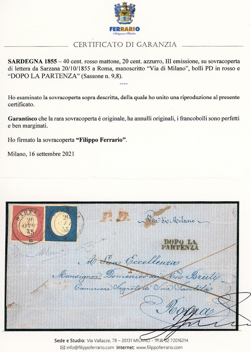 1855 - 40 cent. rosso mattone, 20 cent. azzurro (9,8), perfetti e ben marginati, su sovracoperta di lettera da Sarzana 20/10/1855 a Roma, manoscritto "via di Milano" e bolli PD in rosso e "dopo la partenza". Rara e di ottima qualità, bollo d'arrivo. A. e R.Diena, Raybaudi, cert. Ferrario.