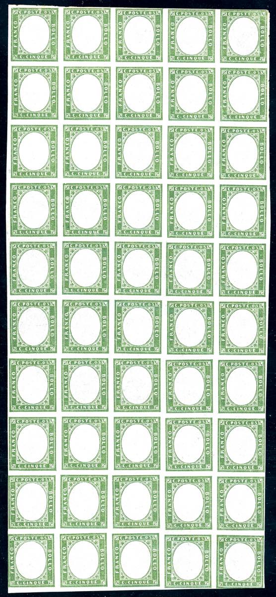 1863 - 5 cent. verde cupo (13E), foglio completo di 50 esemplari, gomma originale integra consuete lievi imperfezioni su qualche esemplare. ... Read more