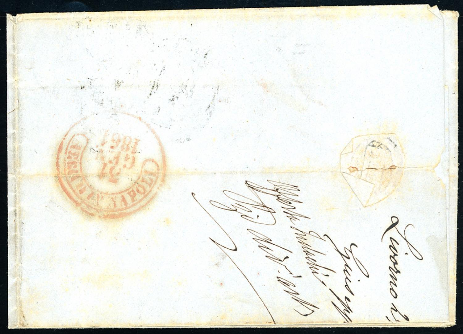 1861 - 40 cent. rosa carminio (16D), perfetto, su lettera di doppio porto da Livorno 29/1/1861 a Napoli, dove in arrivo venne apposto il raro bollo rosso in cartella "franca", manoscritto sul fronte "con vapore". Si tratta probabilmente dell'unica lettera di doppio porto con questa tariffa nel gennaio 1861. Bottacchi, Vaccari. Ex coll. Imperato.