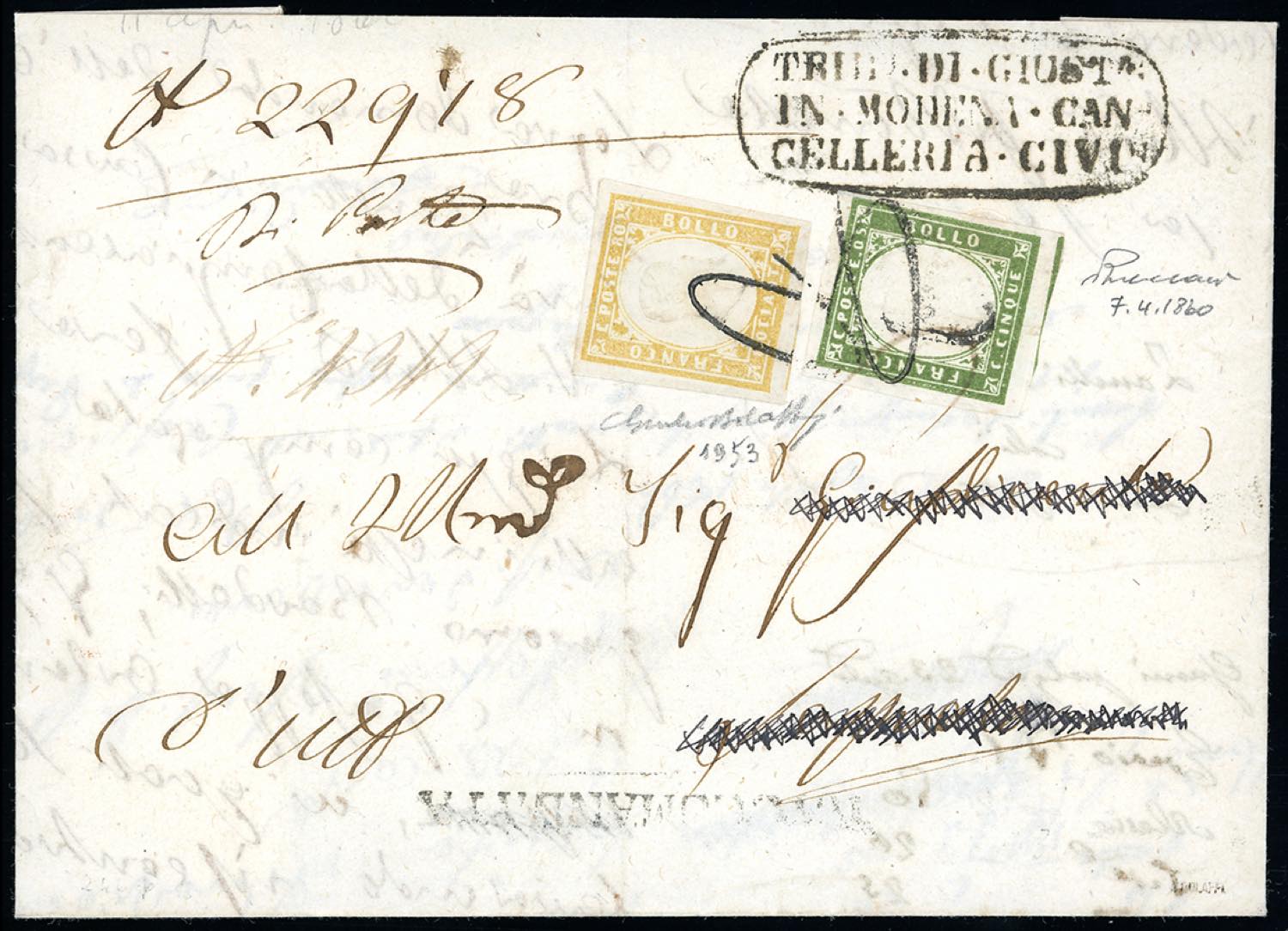 1860 - 80 cent. giallo ocra pallido, 5 cent. verde oliva (17A,13Bc), perfetti e con grandi margini, su fresca lettera raccomandata da Modena 7/4/1860 a Sassuolo. I francobolli vennero annullati con due impronte del bollo di tassa 2 di fornitura sarda. Raro insieme di ottima qualità. Giulio Bolaffi per esteso, cert. Vaccari.