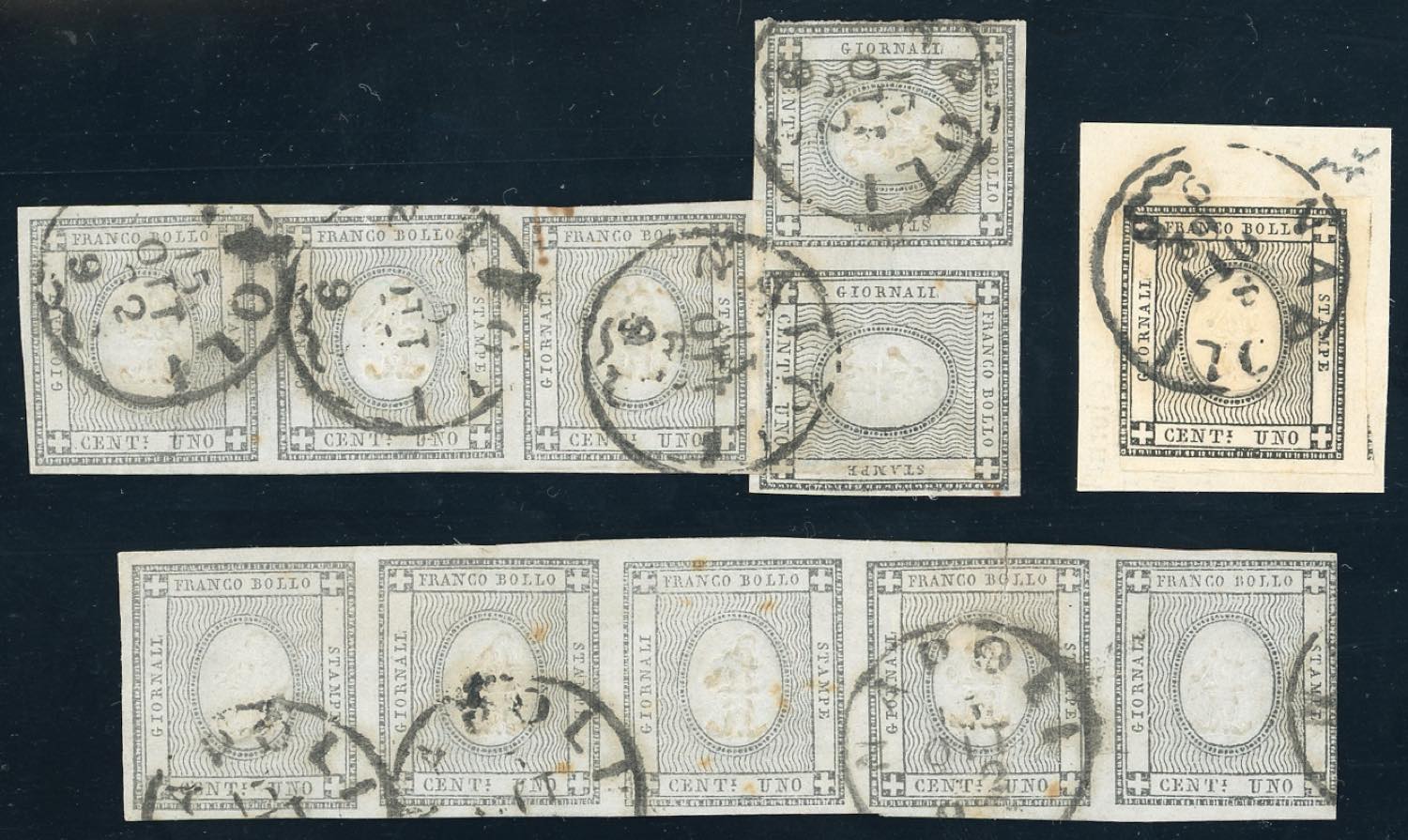 1861 - 1 cent. grigio nero per stampati, striscia di 5 e coppia e striscia di tre che formavano originariamente la stessa affrancatura, inoltre un altro esemplare su frammento (19,19a), tutti usati a Napoli nell'ottobre 1862. Chiavarello. Ex coll. Imperato.