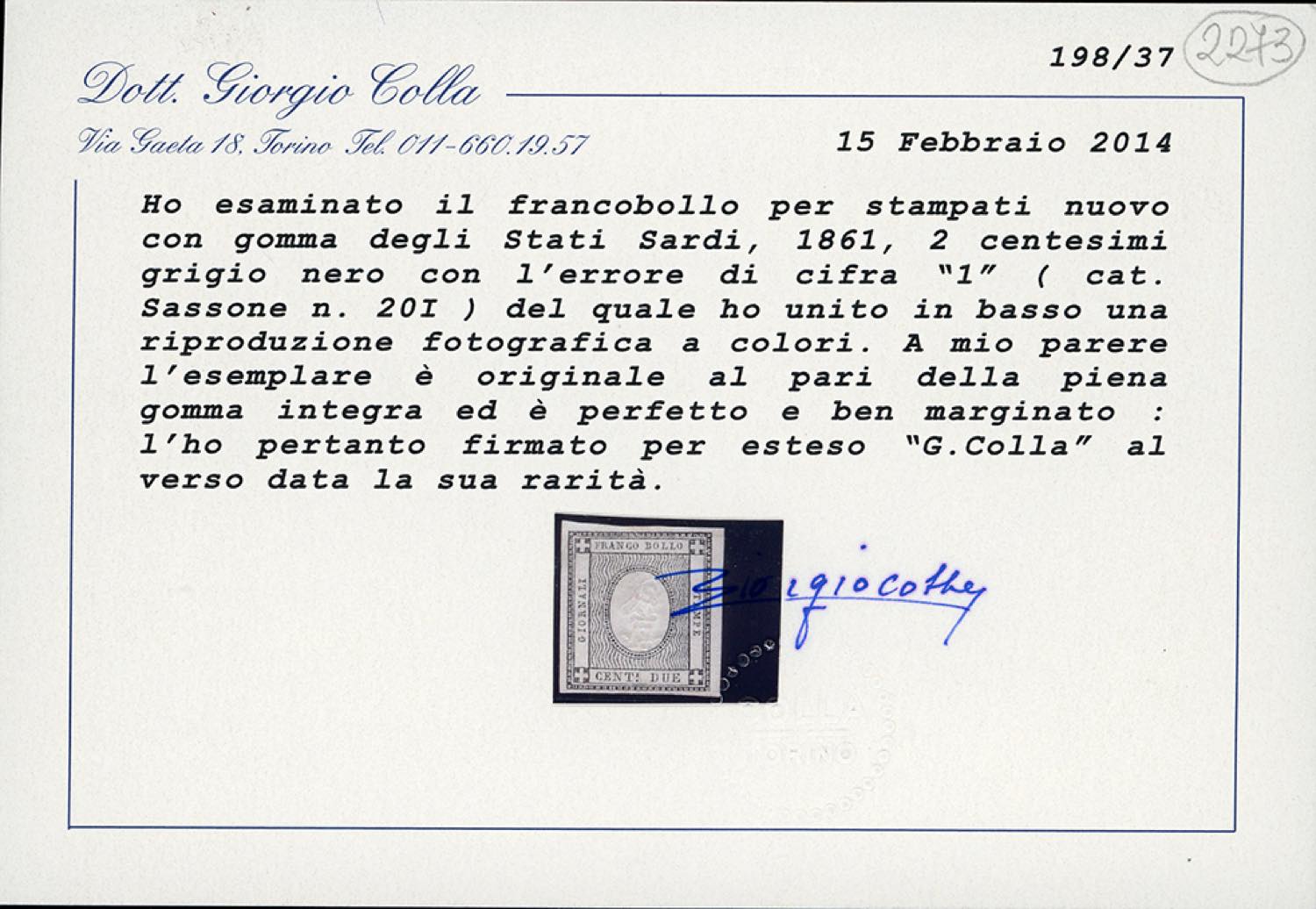 1861 - 2 cent. grigio nero per stampati, errore di cifra "1" al posto di "2" (20l), gomma originale integra, perfetto e ben marginato. Molto bello e raro. A. ed E.Diena, cert. Colla.
