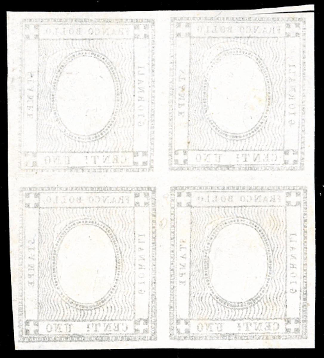 1861 - 1 cent. grigio nero per stampati (19), stampa speculare (decalco?), con impressione dell'effigie al posto della cifra, blocco di ... Read more
