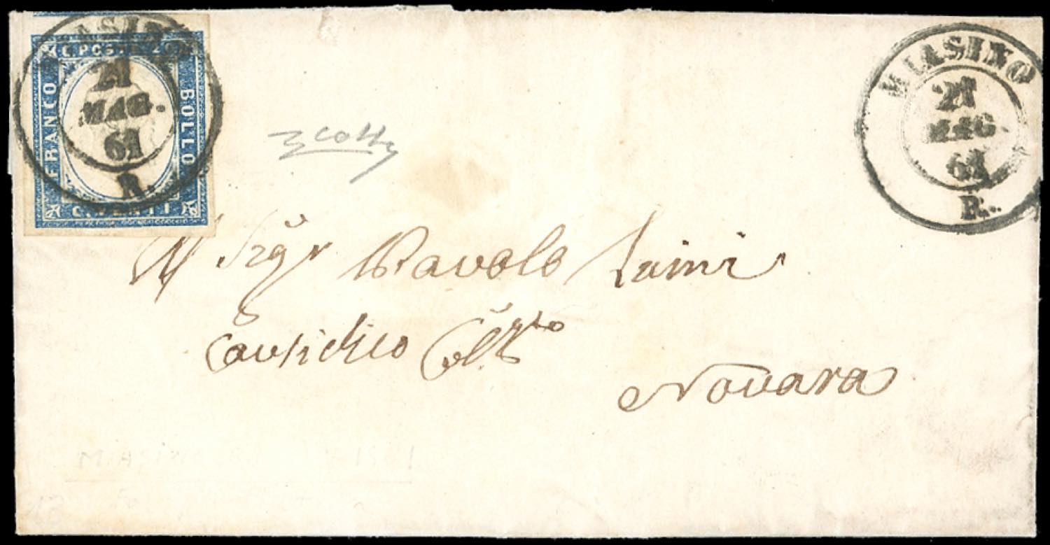 PIEMONTE-MIASINO, punti 13 - 20 cent. (15Db), perfetto e ben marginato, su lettera del 21/5/1861 per Novara. Pregevole annullo, di ottima qualità. Cert. Colla.