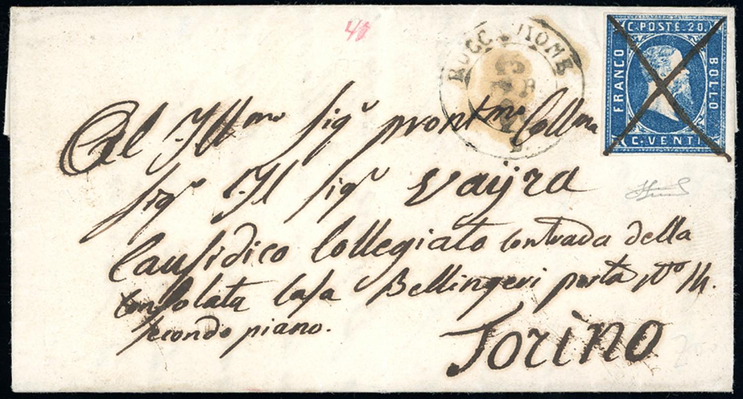 PIEMONTE-ROCCAVIONE a penna, doppio cerchio D, punti R1 - 20 cent. azzurro, I tiratura (2a), due ampi margini, due a filo, perfetto e molto fresco, su lettera del 15/2/1851 a Torino, bollo d'arrivo. Bellissima e molto rara. Cert. Ferrario.