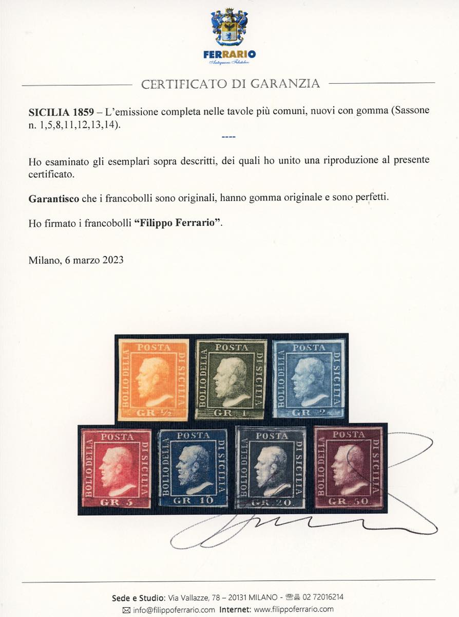 1859 - L'emissione completa nelle tavole più comuni (1,5,8,11,12,13,14), gomma originale, perfetti, ottima qualità. Molto freschi. Cert. Ferrario.