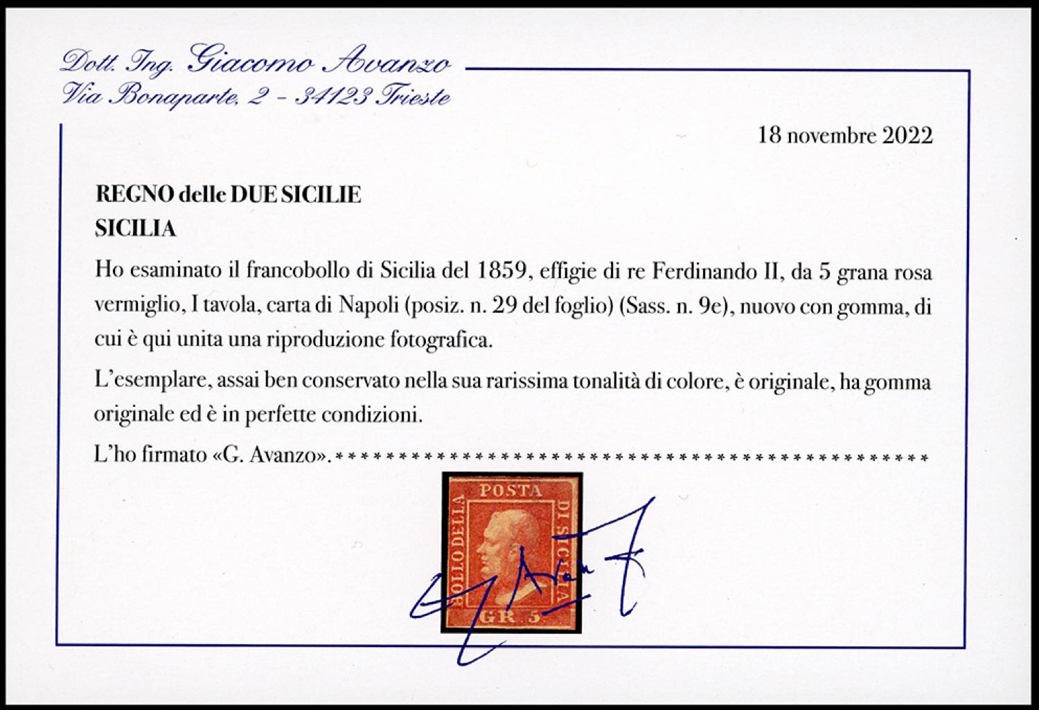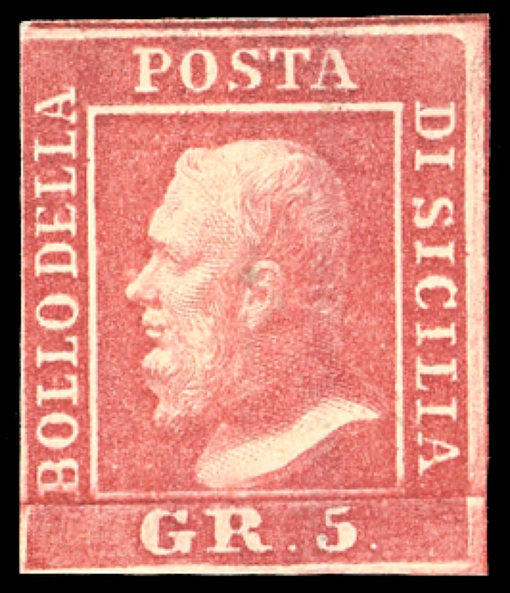 1859 - 5 grana rosa vermiglio, I tavola, pos. 29 (9e), gomma originale, tre ottimi margini, completo a destra, in eccezionali condizioni di freschezza. Rarissimo esemplare, si tratta della più pregiata tonalità di colore di tutti i 5 grana, pochissimi esemplari noti allo stato di nuovo. Cert. Avanzo.