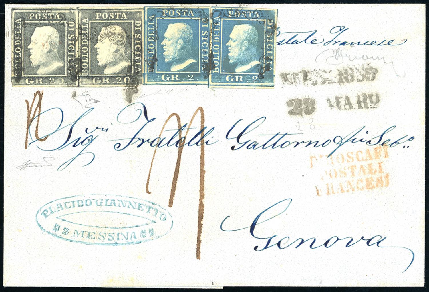 1859 - 20 grana grigio ardesia, coppia orizzontale, 2 grana cobalto I tavola, carta di Napoli, due esemplari (13,6b), perfetti, su lettera da Messina 28/3/1859 a Genova, trasportata con i "Piroscafi postali francesi", bollo in rosso, e tassata 40 cent. Estremamente rara la coppia del 20 grana su lettera. Molto bella. Grioni, A.Bolaffi, cert. E.Diena, Ferrario.