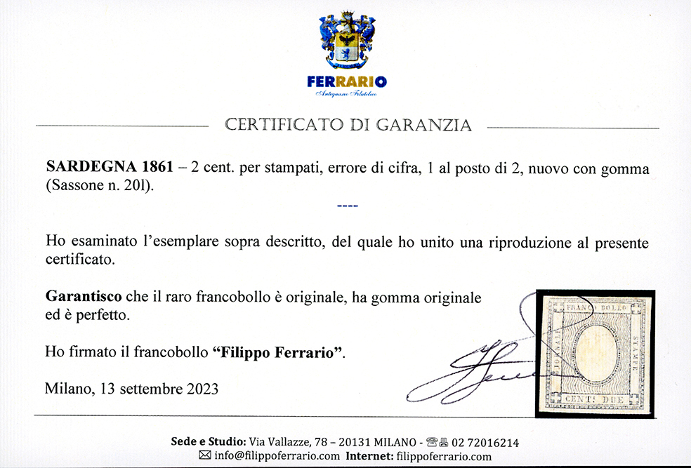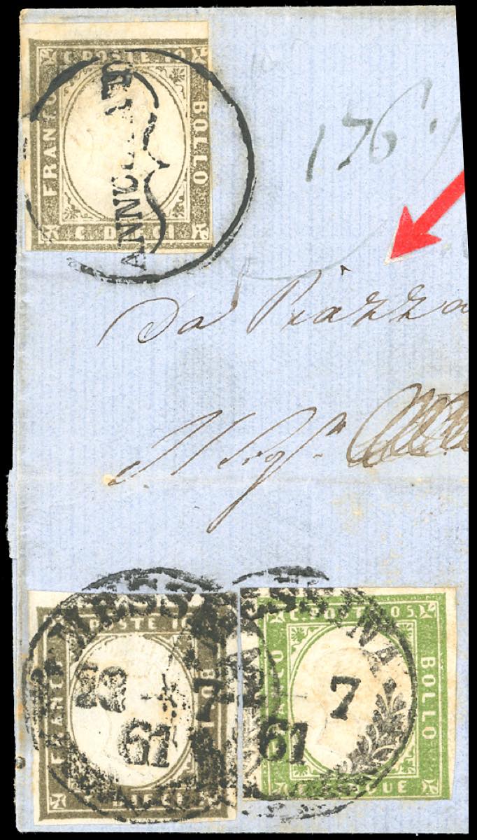 PIAZZA, a penna (inedito) + "ANNULLATO" cerchio con graffa + ASSICURATA ovale senza fregi rosso (punti R3), combinazione inedita - 10 cent. due esemplari annullati in partenza e 10 cent. di tinta diversa con 5 cent. (13Cc), annullati in arrivo a Messina il 22/7/1861, su lettera assicurata di primo porto. La lettera, unica nel suo genere, è l'unica nota con il manoscritto "da Piazza" e presenta una combinazione di bolli inedita da classificarsi R3. Benchè presenti difetti di marginatura, è di eccezionale rarità ed importanza storico postale. Cert. Ferrario, ex collez. Nino Aquila.