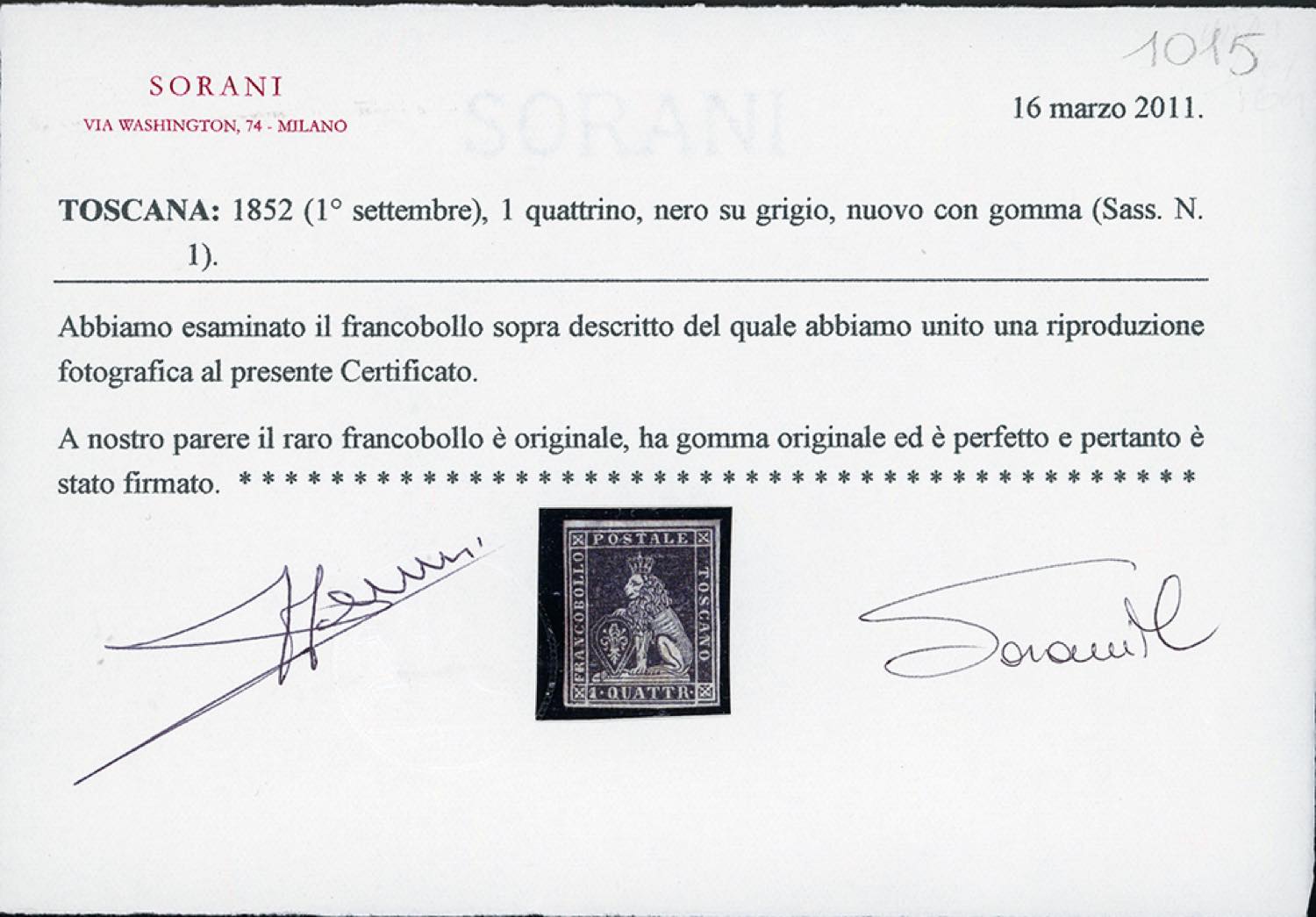 1851 - 1 quattrino nero su grigio (1), gomma originale, perfetto e ben marginato. Raro e di ottima qualità. Cert. Sorani.