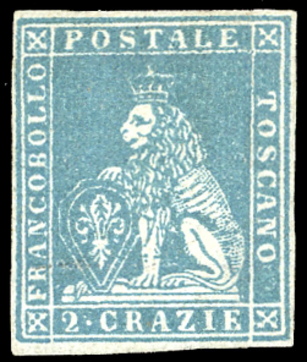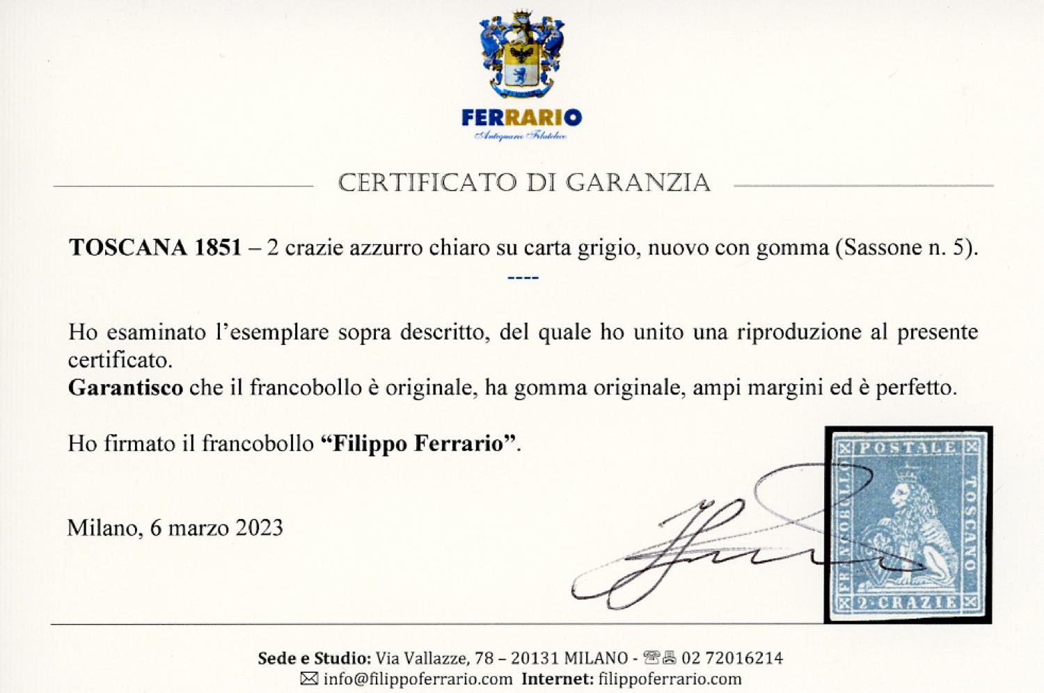 1851 - 2 crazie azzurro chiaro su carta grigia (5), nuovo, gomma originale, lieve traccia di linguella, perfetto, ampi margini. Raro di questa qualità. Cert. Ferrario.