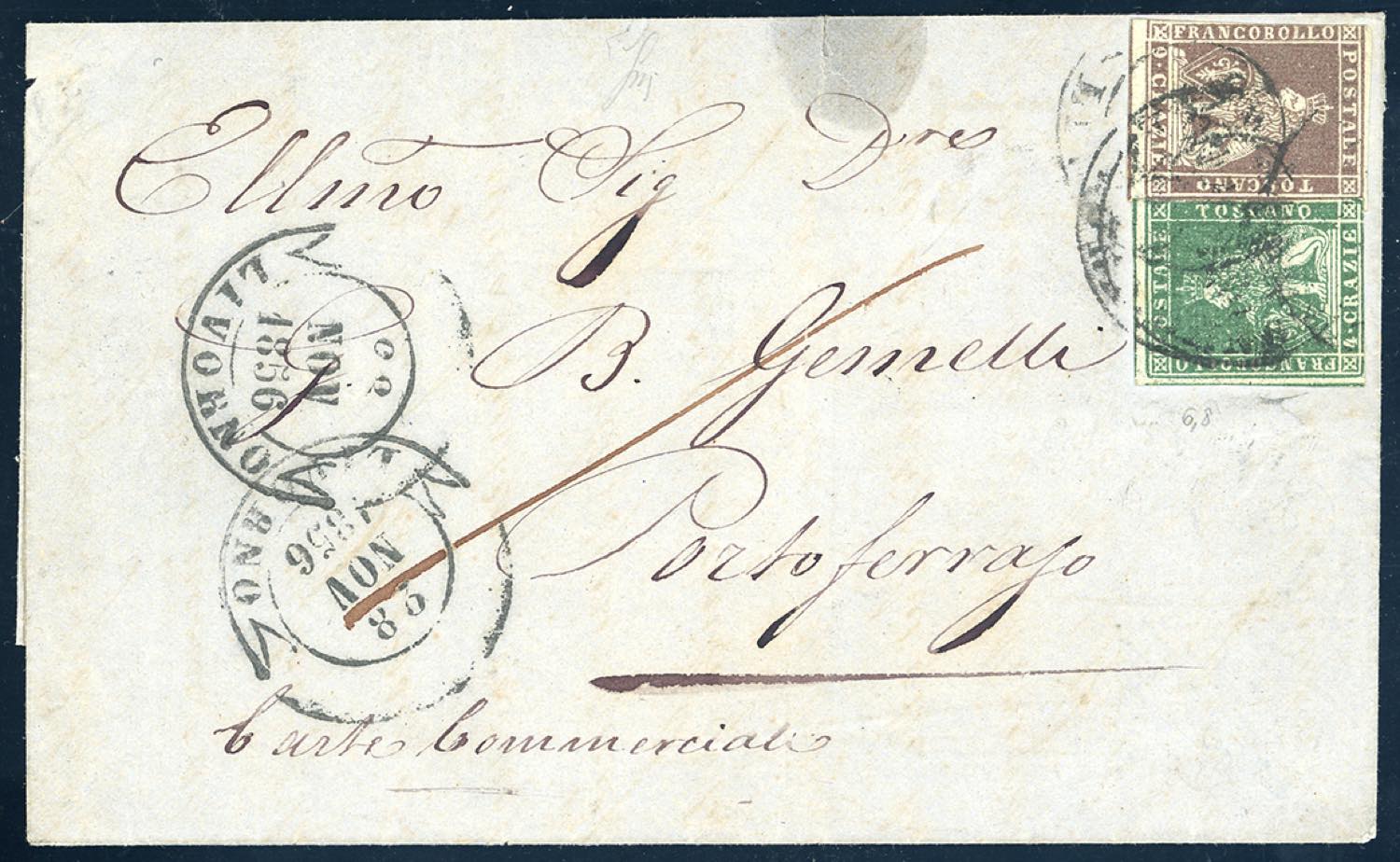 1856 - 4 crazie verde, 9 crazie bruno violaceo, entrambi su carta grigia (6,8), entrambi con interspazio di gruppo, difetti di marginatura, su lettera con "carte commerciali" manoscritto, da Livorno 28/11/1856 a Portoferraio. Interessante tarfiffa, da studiare.