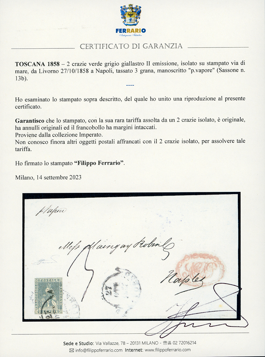 1858 - 2 crazie verde grigio giallastro II emissione (13b), isolato su stampato via di mare, da Livorno 27/10/1858 a Napoli, tassato 3 grana, manoscritto "p.vapore". TARIFFA ESTREMAMENTE RARA, INSIEME UNICO. Chiavarello, cert. Ferrario. Ex coll. Imperato.