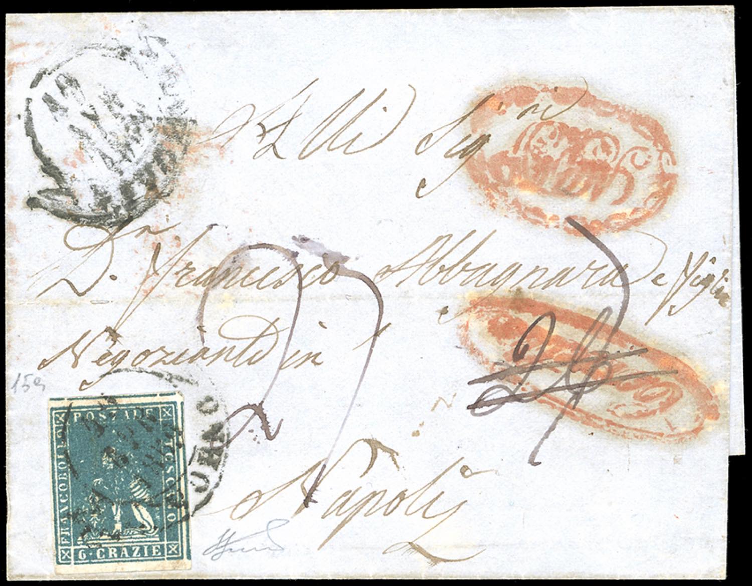 1859 - 6 crazie azzurro vivo, II emissione (15a), perfetto, ottimi margini, isolato su fresca lettera da Livorno 20/4/1859 a Napoli, tassata 26 grana, corretti in 27, come da bollo apposto sulla prima tassazione. Ultimi giorni del Granducato. Molto bella ed insolito insieme. Ferrario. Ex coll. Imperato.
