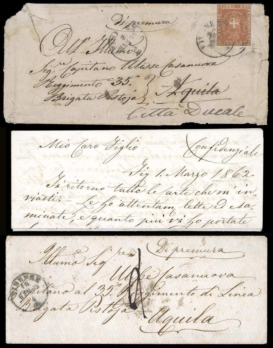 1862 - 80 cent. carnicino (22), difetti, su busta di 4 porti da Firenze 2/3/1862 a L'Aquila, rispedita a Città Ducale, indirizzata ad un Capitano della Brigata Pistoja, allegato il testo interno. Unita una busta dello stesso archivio spedita non affrancata da Firenze 18/1/1862 a L'Aquila. Rarissimo porto multiplo per l'interno, UNICA FINORA NOTA. Chiavarello per la lettera affrancata e cert. Ferrario. Ex coll. Imperato.