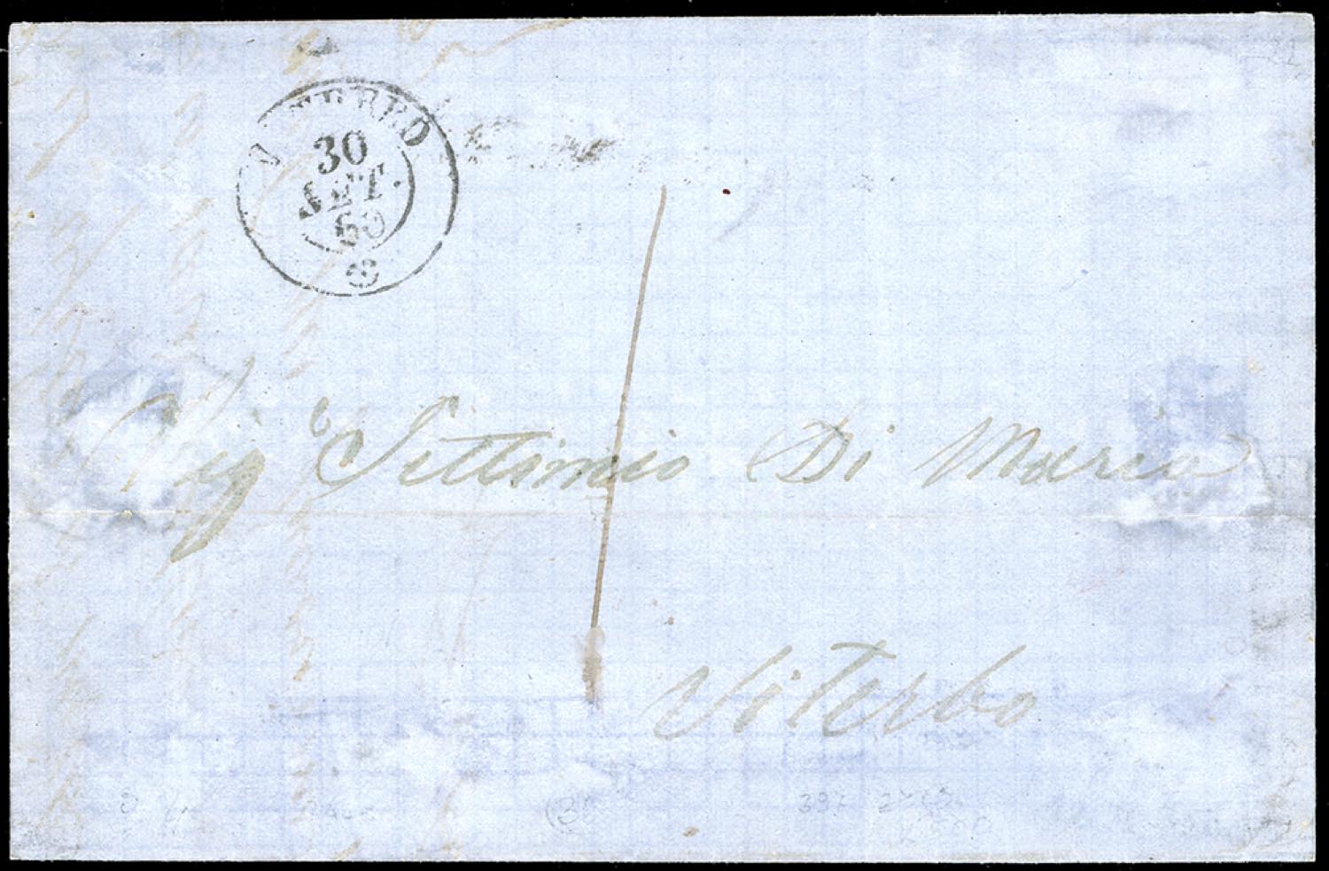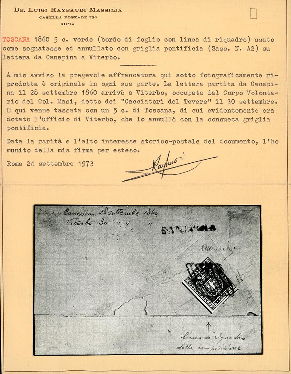 1860 - 5 cent. verde (A2), linea di riquadro verticale a sinistra, leggermente intaccato a destra, al verso di lettera in porto assegnato da Canepina 28/9/1860 a Viterbo, dove il francobollo è stato annullato con la griglia ponitificia. Rarità risorgimentale. Em. e A.Diena, Mezzadri, cert. Raybaudi.
