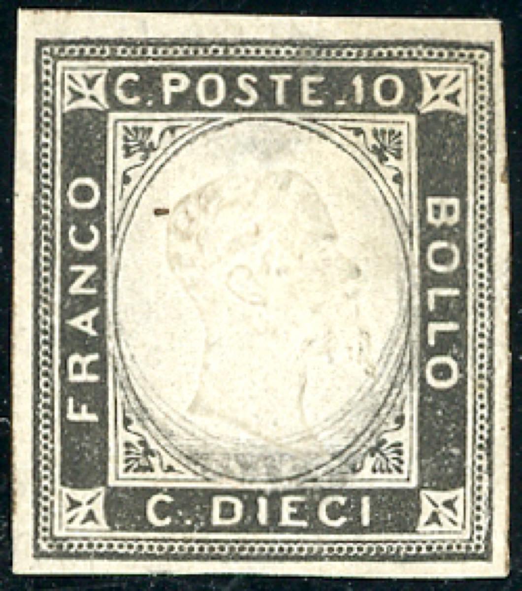 1861 - 10 cent., non emesso, prova di stampa in nero (2), non gommata, piccolo assottigliamento al verso, ottimi margini. Si tratta di uno dei due soli esemplari finora noti. Rarità, Cert. A.Diena e Ferrario.