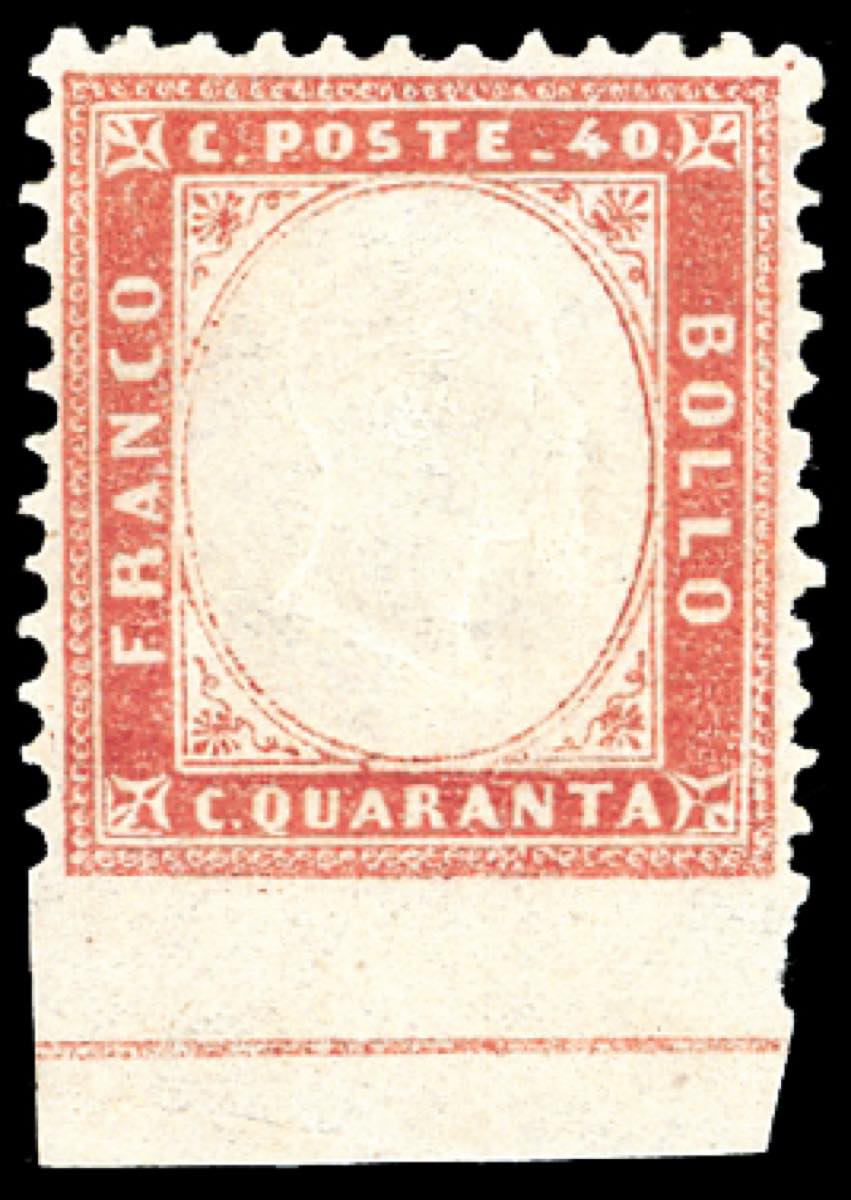 1862 - 40 cent. rosa carminio, non dentellato in basso con bordo integrale di foglio e linea di riquadro (3l), gomma originale integra, perfetto. Due cert. Raybaudi.