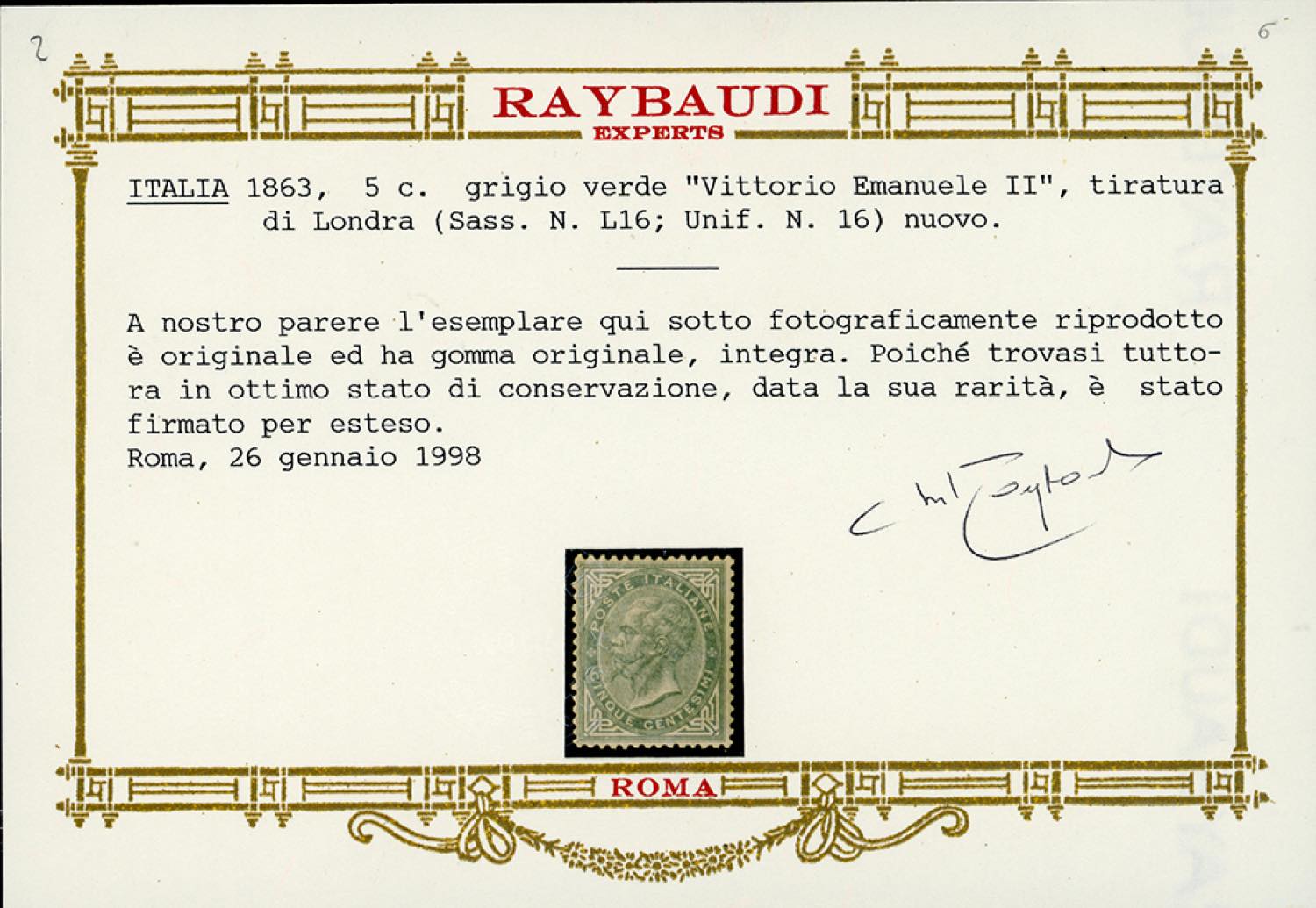 1863 - 5 cent. De La Rue, tiratura di Londra (L16), ottima centratura, gomma originale integra, perfetto. Fiecchi, cert. Oro Raybaudi.