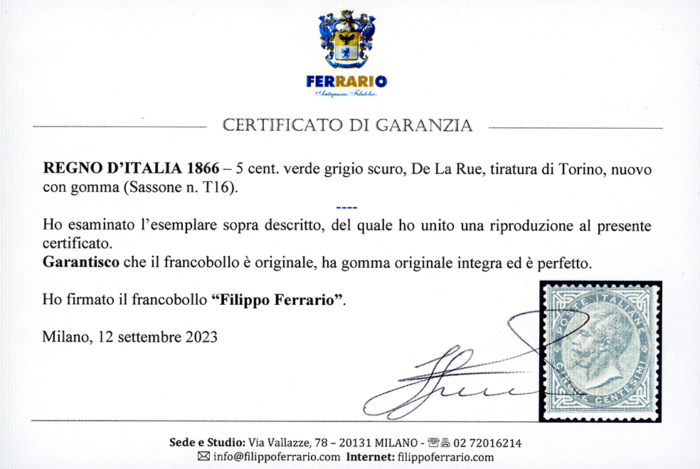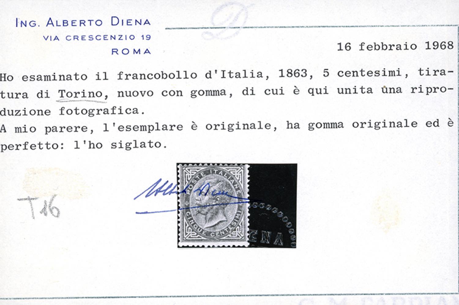1866 - 5 cent. De La Rue, tiratura di Torino (T16), discreta centratura, gomma originale integra, perfetto. Cert. A.Diena e Ferrario.