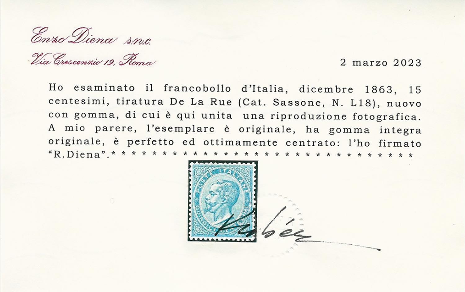 1863 - 15 cent. De La Rue (L18), ottima centratura, gomma originale integra, perfetto. Bello e raro, eccezionale freschezza. A.Diena, ... Read more