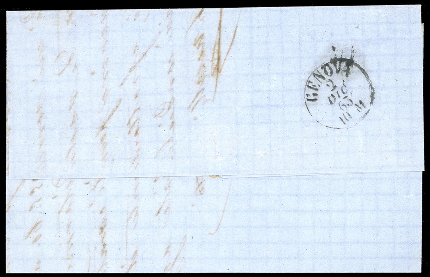 1863 - 15 cent. De La Rue (L18), perfetto, su lettera da Bologna 1/12/1863 a Genova. Interessante e pregevole lettera risalente al PRIMO ... Read more