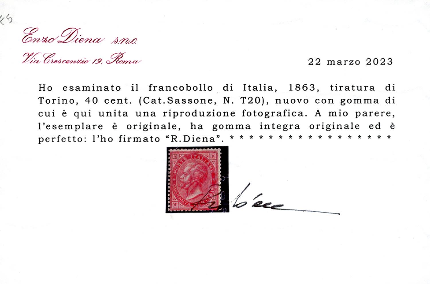 1866 - 40 cent. De La Rue, tiratura di Torino (T20), discreta centratura, gomma originale integra, perfetto. A.Diena, cert. Diena.