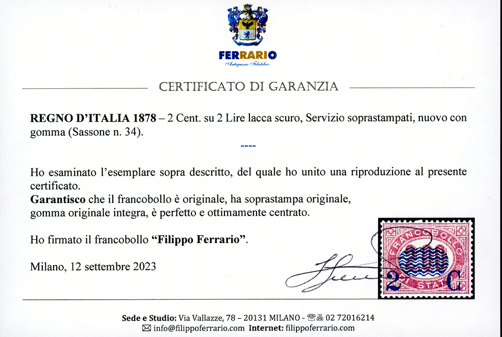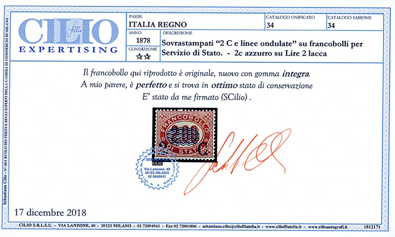 1878 - 2 cent. su 2 lire Servizio soprastampati (34), ottima centratura, gomma originale integra, perfetto, molto fresco. Cert. Cilio e Ferrario.