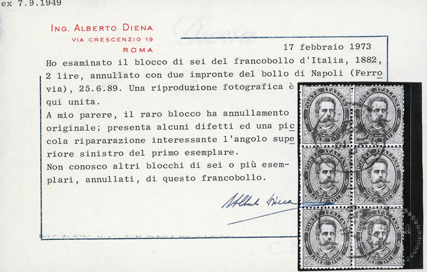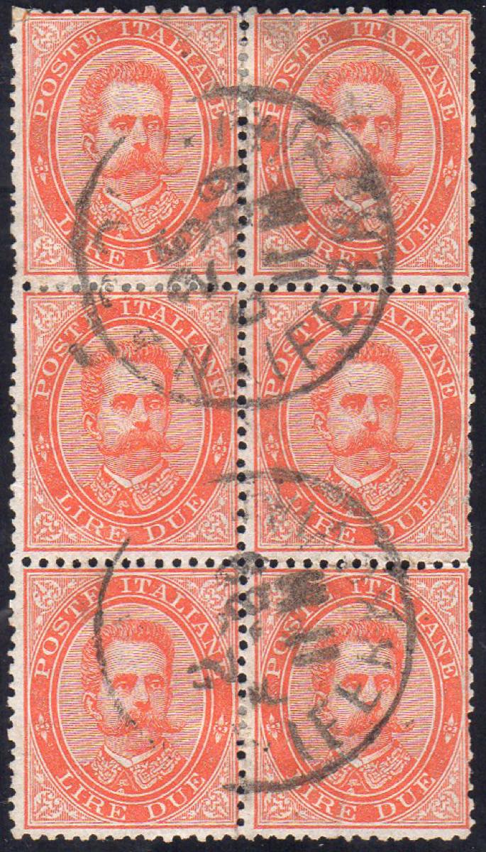 1879 - 2 lire Umberto I (43), blocco di sei esemplari usati, alcuni difetti e una piccola riparazione all'angolo superiore sinistro. GRANDE ... Read more