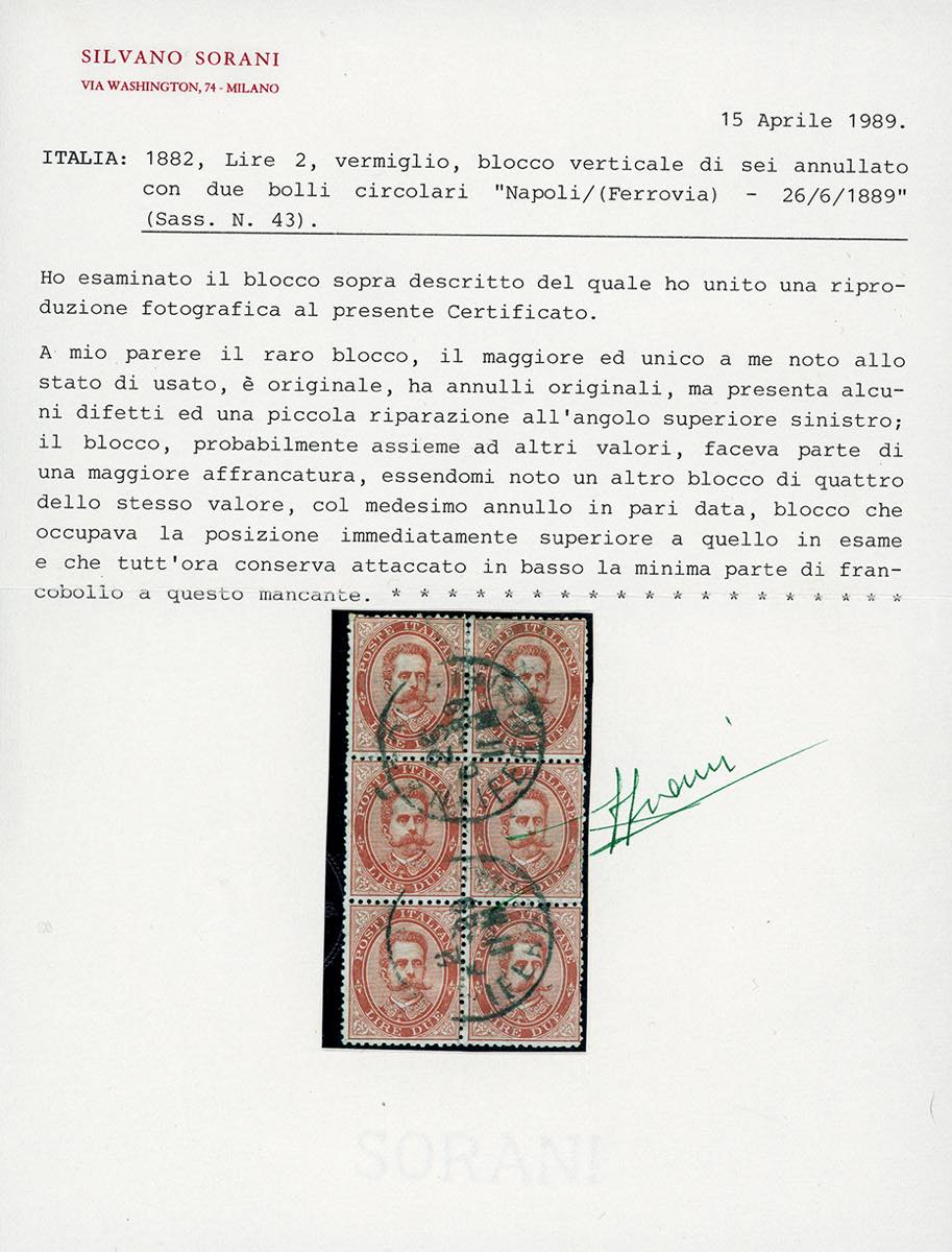 1879 - 2 lire Umberto I (43), blocco di sei esemplari usati, alcuni difetti e una piccola riparazione all'angolo superiore sinistro. GRANDE RARITA', MASSIMO BLOCCO NOTO USATO. Si conoscono solo altri due blocchi di quattro usati. Cert. Diena, Sorani (Sassone quota la quartina € 45.000).