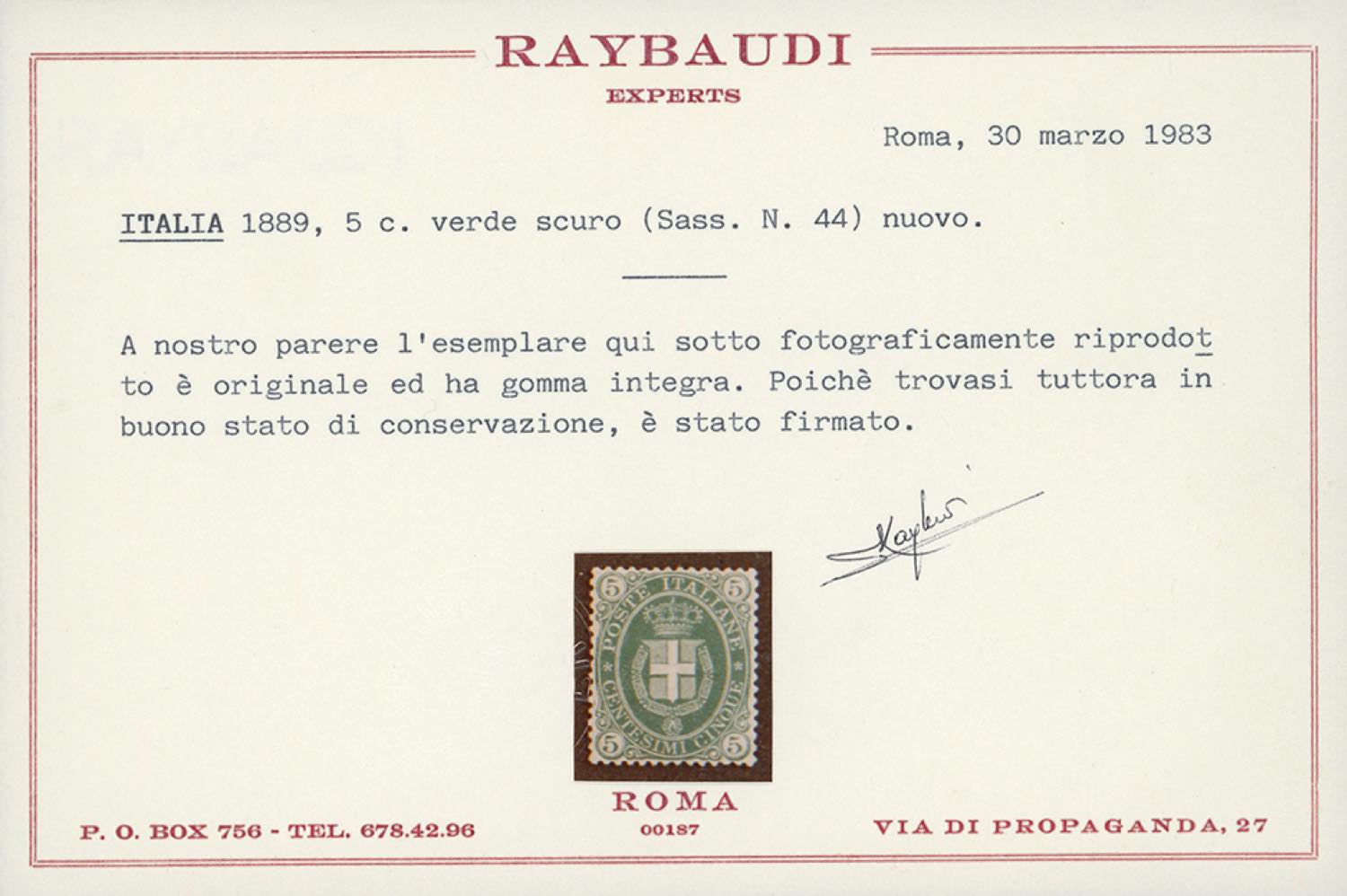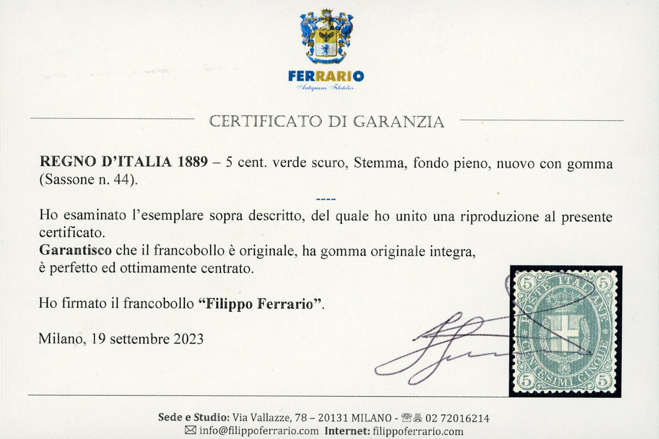 1889 - 5 cent. Stemma, fondo pieno (44), ottima centratura, gomma originale integra, perfetto. A.Diena, cert. Raybaudi e Ferrario.