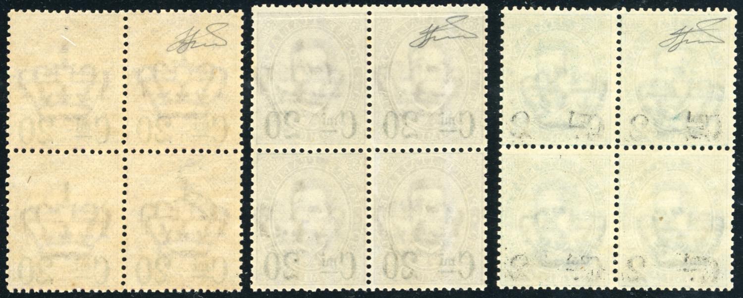 1890/91 - Soprastampati (56/58), blocchi di quattro, buona centratura, gomma originale integra, perfetti. Splendidi e rari! Cert. Ferrario.
