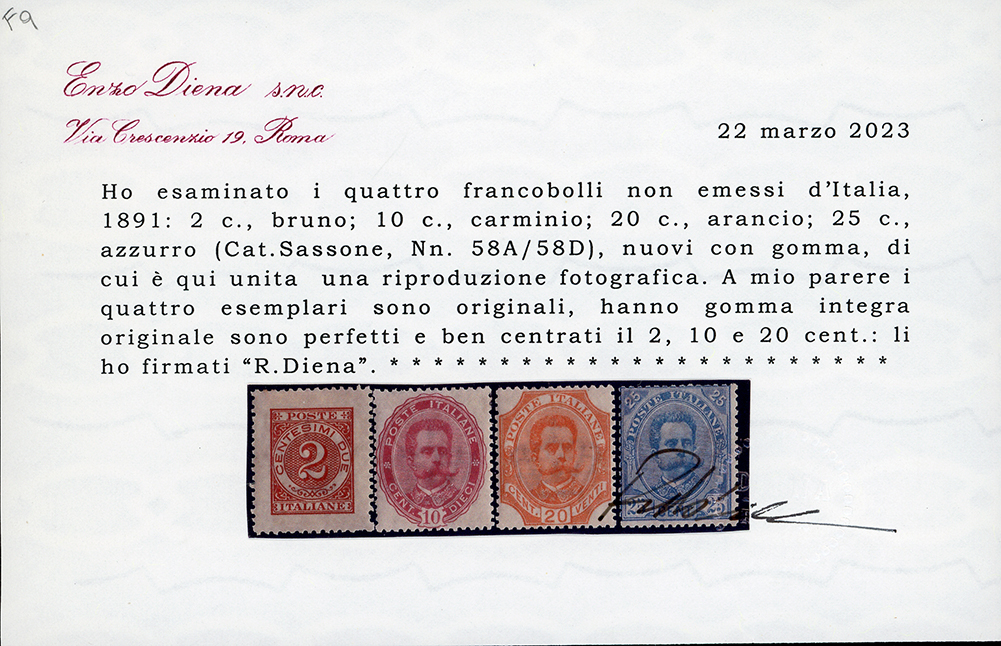 1891 - Umberto I, non emessi, serie completa (58A/58D), gomma originale integra, perfetti. Il 25 cent. con buona centratura, gli altri ottima. Splendidi e molto rari, solo poche serie esistenti. Cert. Diena e Ferrario.