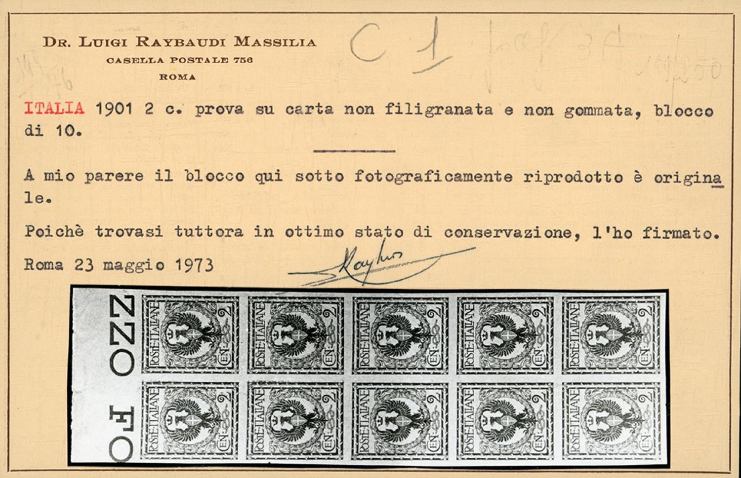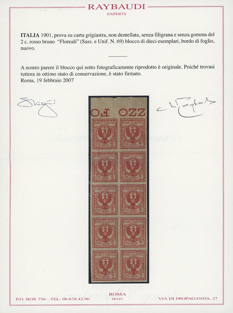 1902 - 2 cent. Floreale, prova su carta grigiastra, senza filigrana e senza gomma, non dentellata (P69), blocco di 10 esemplari, bordo di foglio, perfetti. Insieme molto raro. Due cert. Raybaudi e cert. Caffaz (cat.CEI € 35.000).