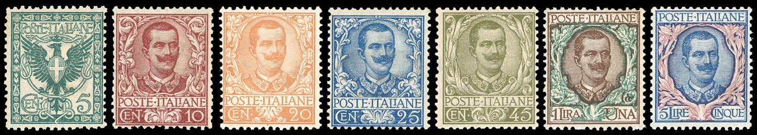 1901 - Floreale, 7 valori (70/73,75,77/78), gomma originale integra, perfetti, molto freschi. A.Diena per il 25 cent.