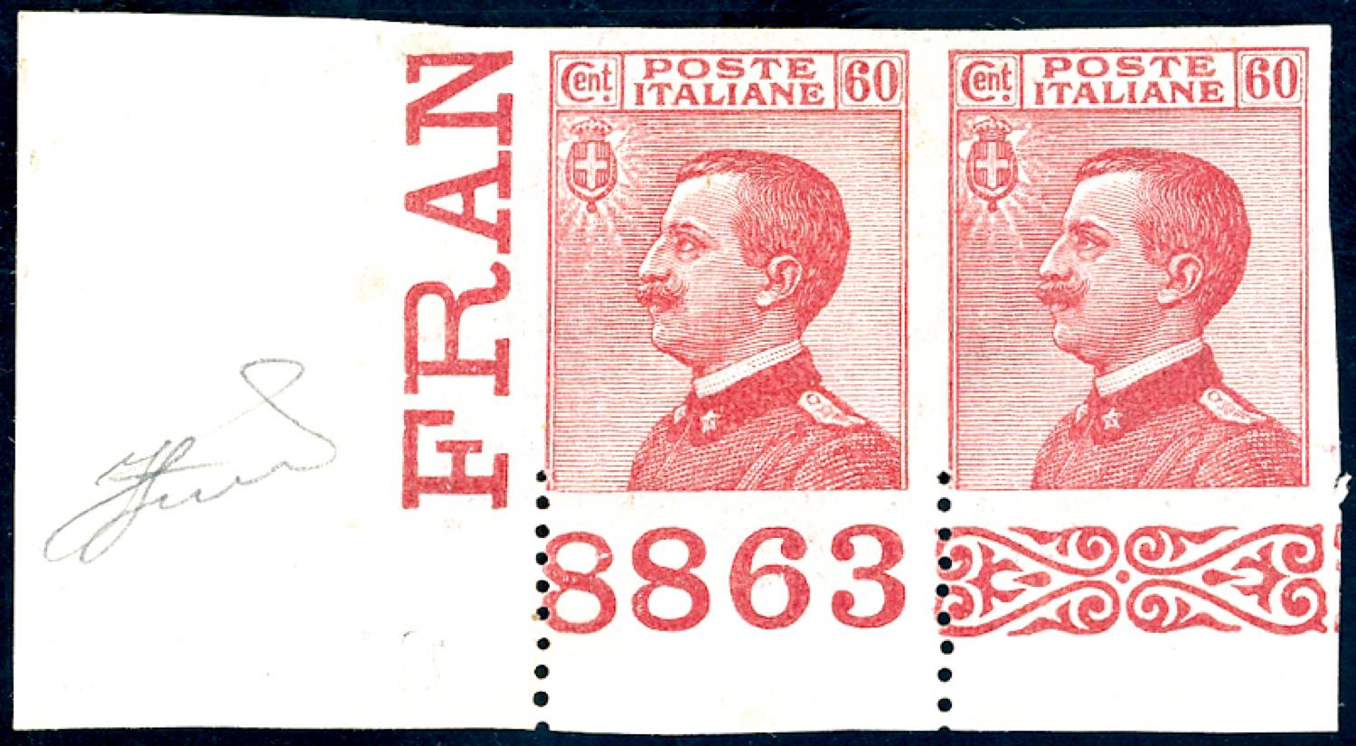 1918 - 60 cent. carminio Michetti, non dentellato, traccia della sola dentellatura verticale sul margine di foglio inferiore (111), coppia orizzzontale angolo di foglio inferiore sinistro con numero di tavola 8863, nuova, gomma originale, lieve traccia di linguella, perfetta. Splendida varietà non catalogata, insieme unico. Cert. Ferrario.