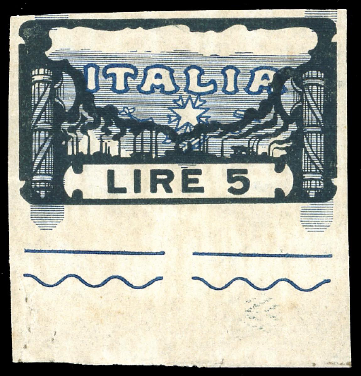 1923 - 5 lire Marcia su Roma, prova d'archivio, non dentellata, centro fortemente spostato in basso (P146), bordo di foglio, gomma originale integra, perfetta e molto fresca. Chiavarello, Ferrario.