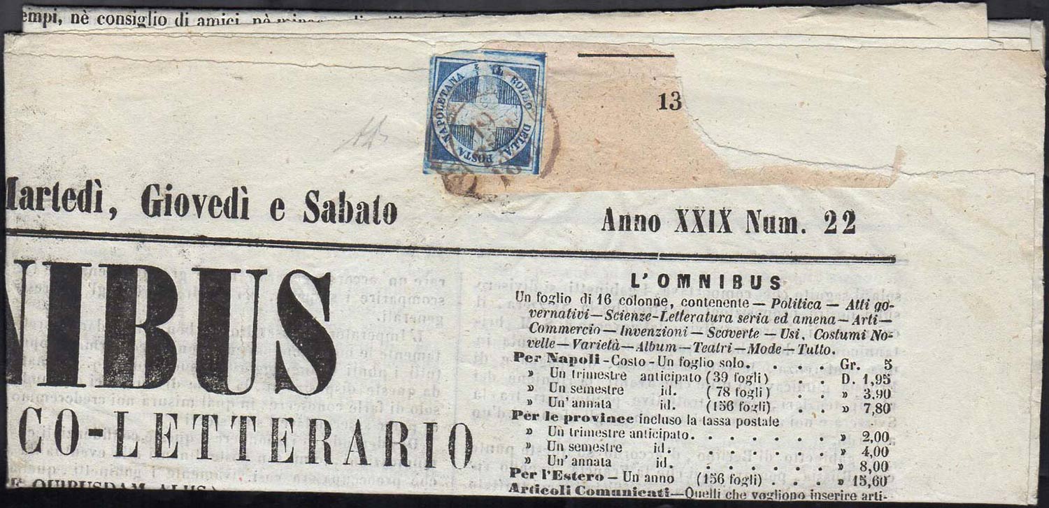 1861 - 1/2 tornese azzurro Crocetta (16), perfetto, su giornale completo "L'Omnibus" spedito da Napoli 19/2/1861. Raro! Cert. A.Diena.