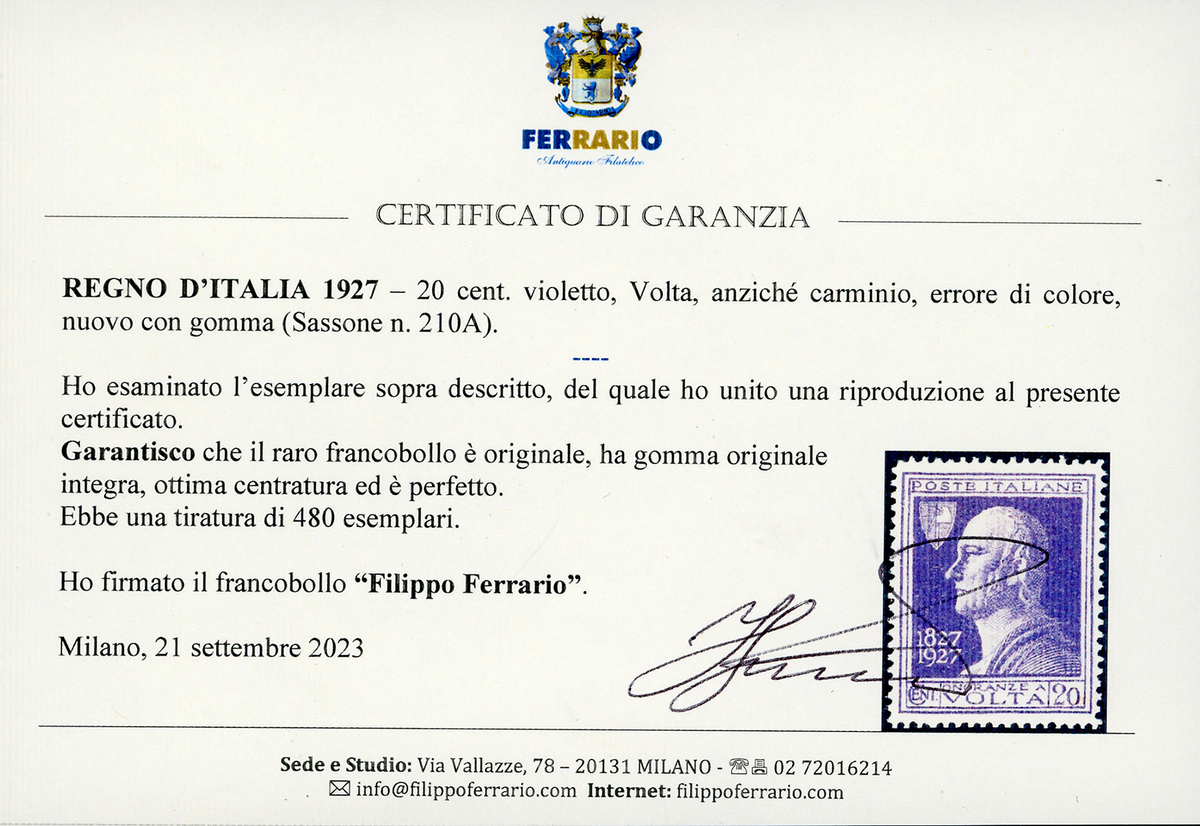 1927 - 20 cent. Volta violetto, anziché carminio, errore di colore (210A), centratura eccezionale, gomma originale integra, perfetto e di grande freschezza. Splendido, estremamente raro di questa qualità. Tiratura 480 esemplari di cui pochissimi ottimamente centrati. Emilio Diena, cert. Ferrario.