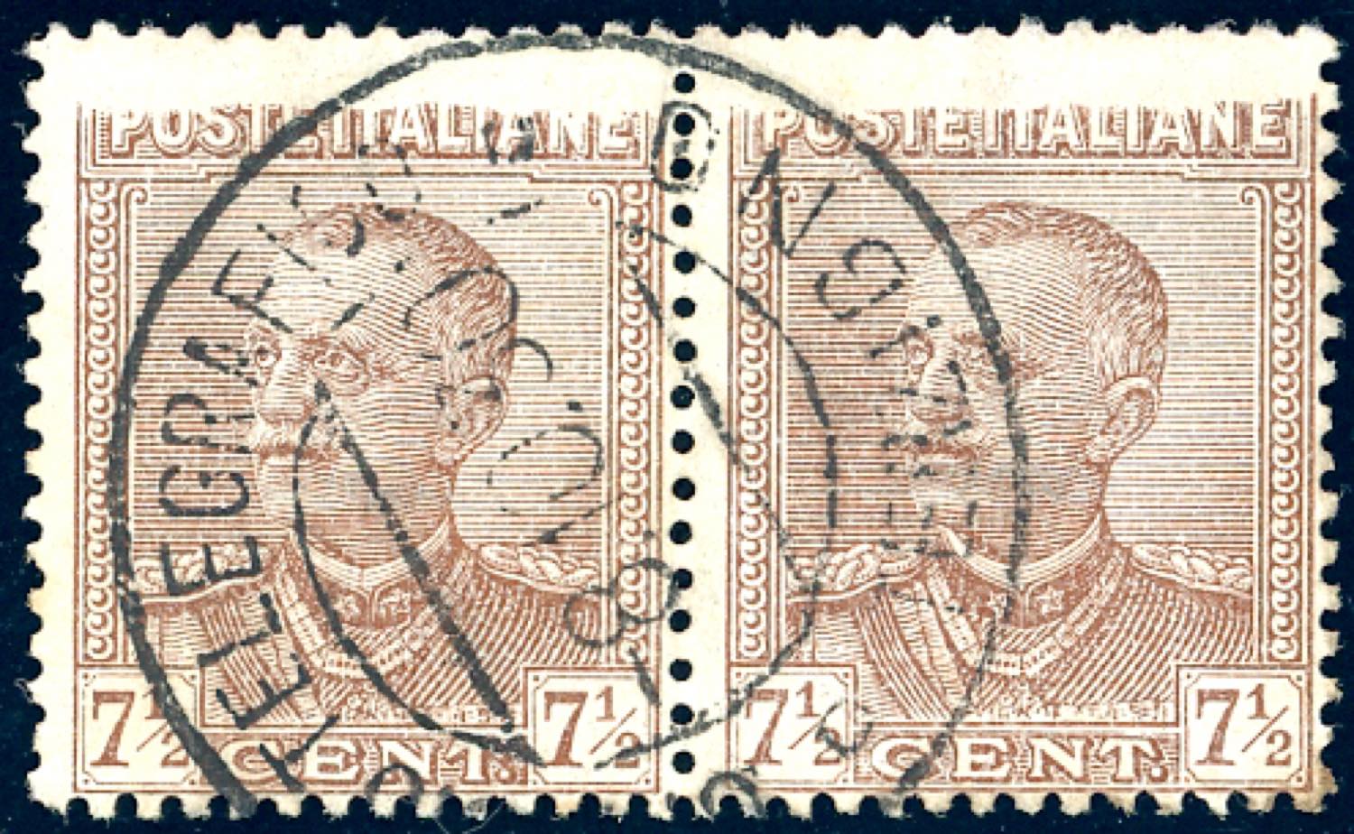 1928 - 7 1/2 cent. Parmeggiani (224), coppia orizzontale, entrambi gli esemplari con stampa incompleta in alto, usata, perfetta. Rara varietà, non catalogata. Ferrario.