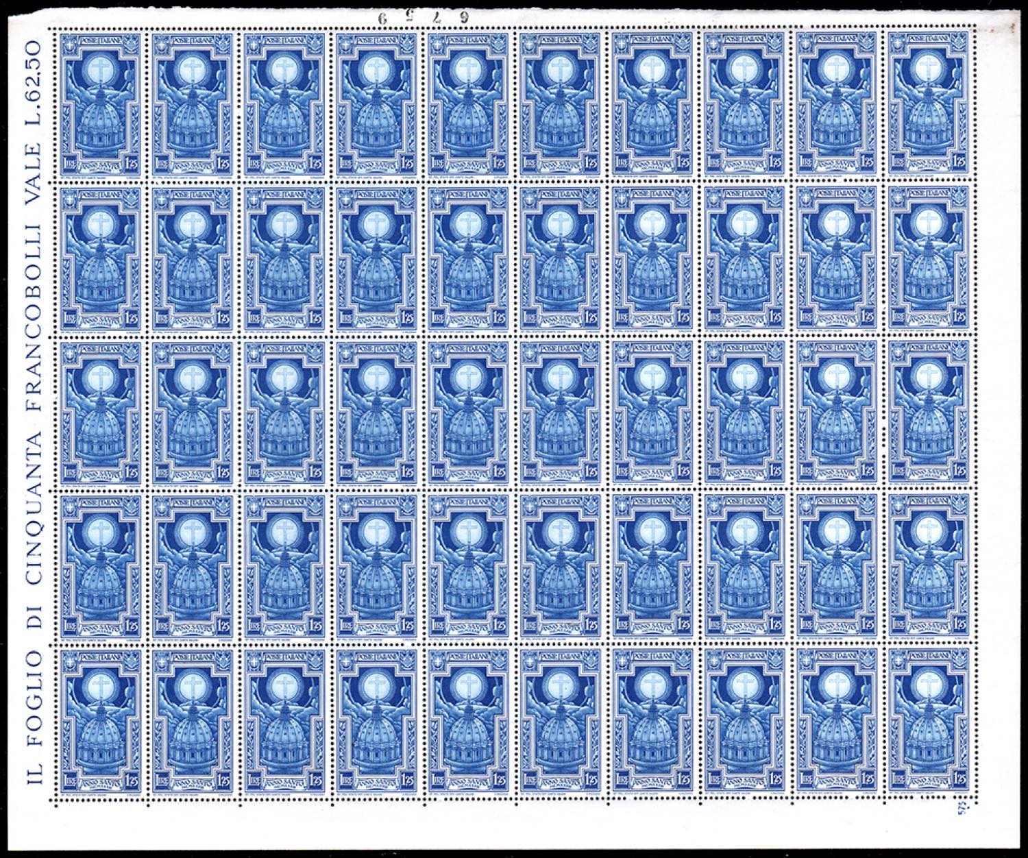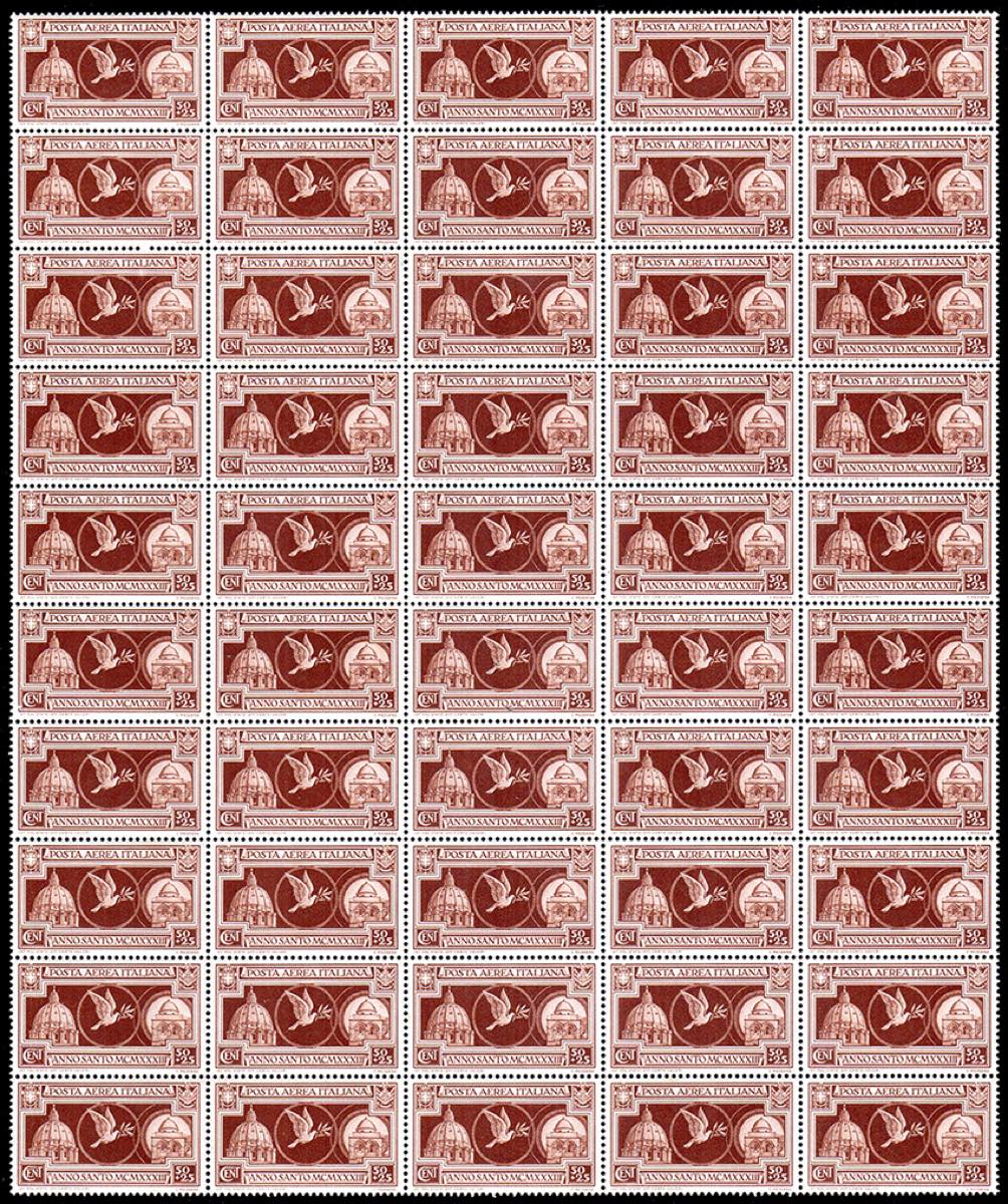 1933 - Anno Santo, serie completa (345/349+A), fogli completi di 50 esemplari, gomma originale integra, perfetti, lievi ossidazioni su alcuni francobolli di posta aerea. Rari.