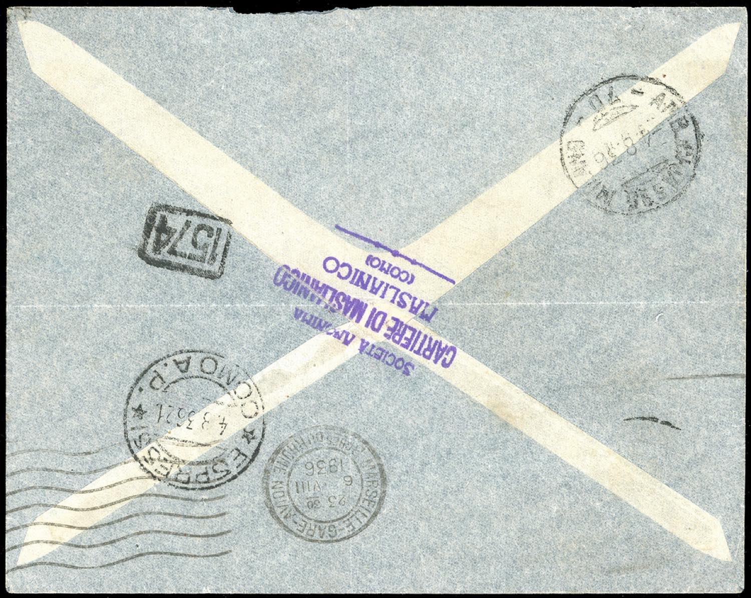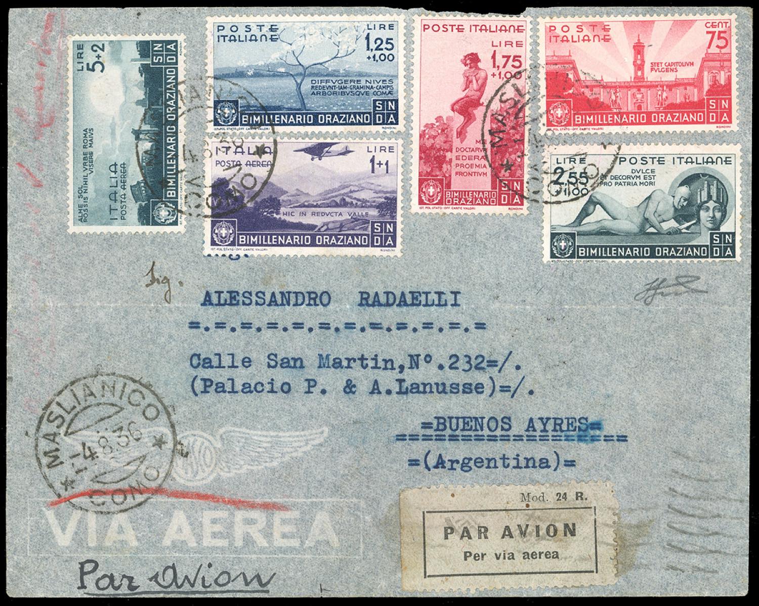 1936 - 75 cent., 1,25 + 1 lira, 1,75 + 1 lira, 2,55 + 1 lira posta ordinaria, 1+1 lira, 5 + 2 lire posta aerea, Orazio (402/405,A98/A99), perfetti, su aerogramma da Maslianico 4/8/1936 a Buenos Aires, Argentina. Bolli di transito e arrivo al verso. Raro. Cert. Ferrario.