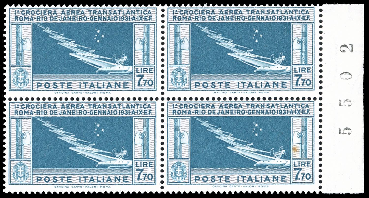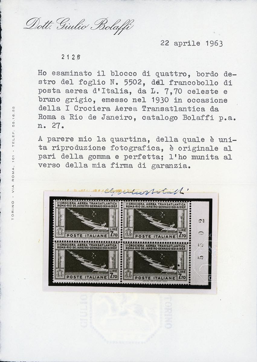 1930 - 7,70 lire Crociera Balbo (25), blocco di quattro, bordo di foglio, gomma originale integra, perfetto ad eccezione di un esemplare che presenta un puntino di abrasione al recto. Cert. G.Bolaffi.