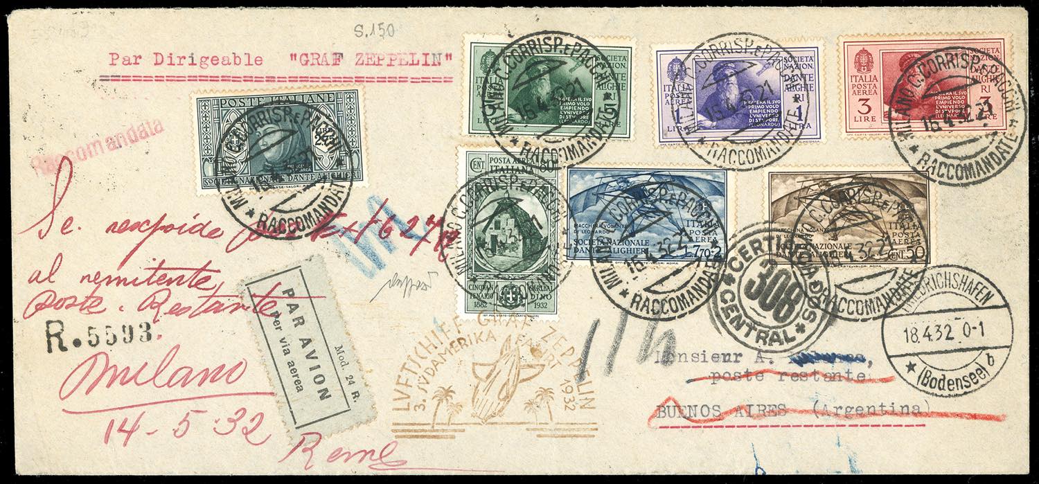 1932 - 2,75 lire, 50 cent., 1 lira, 3 lire, 5 lire, 7,70 + 2 lire Dante, 80 cent. Garibaldi (312,A26/A30,A33), perfetti, su aerogramma raccomandato da Milano 16/4/1932 a Buenos Aires, rispedita al mittente, sul fronte il bollo speciale figurato della 3a Crociera Zeppelin In Sudamerica. Cert. Caffaz.