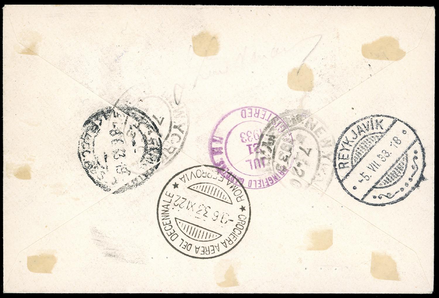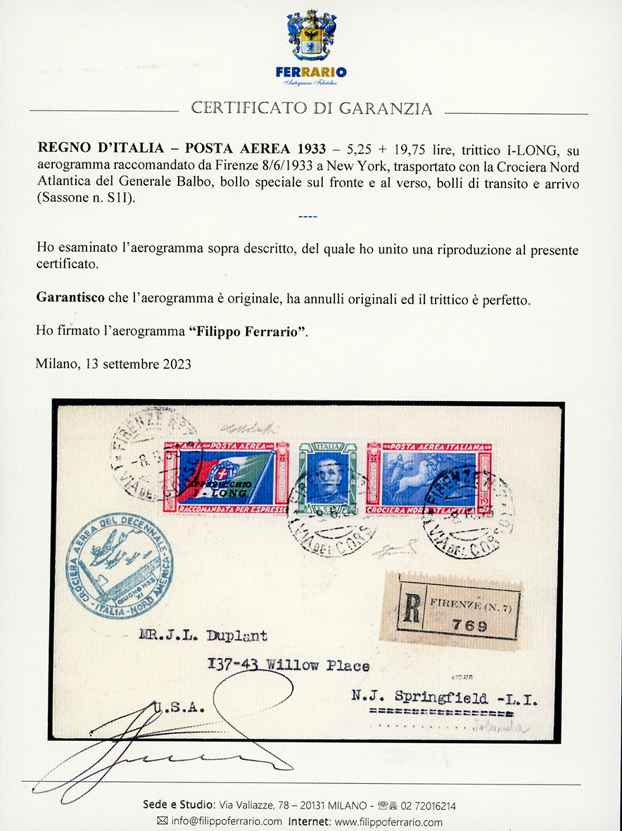 1933 - 5,25 + 19,75 lire Trittico I-LONG (S1I), perfetto, su aerogramma raccomandato da Firenze 8/6/1933 a New York, trasportato con la Crociera del Generale Balbo, bollo speciale sul fronte e al verso, transito di Reykjavik. Rara e di splendida qualità. G.Bolaffi, cert. Ferrario.