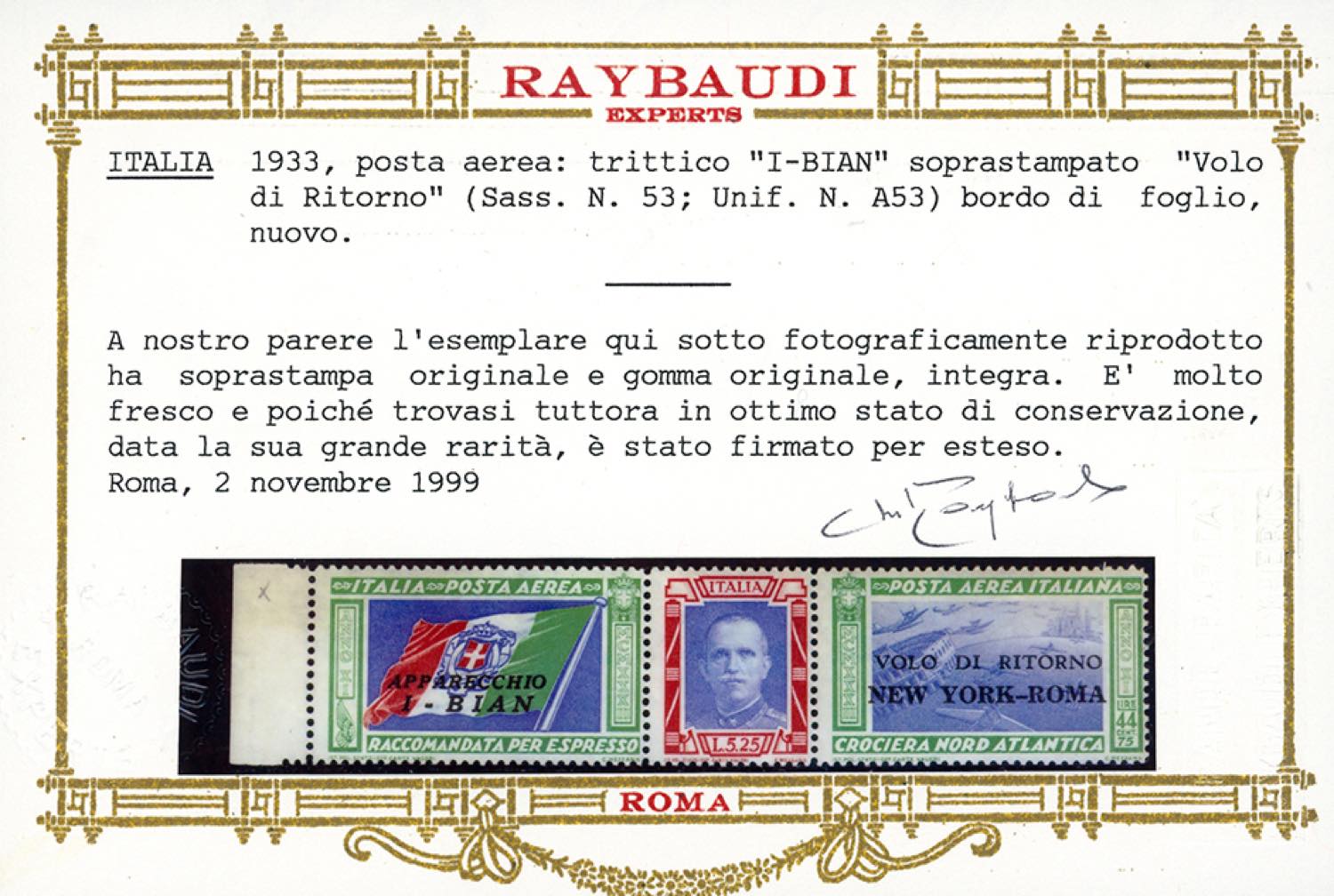 1933 - 5,25 + 44,75 lire trittico I-BIAN, soprastampato "VOLO DI RITORNO" (53), bordo di foglio, gomma originale integra, perfetto. Uno di soli 25 esemplari soprastampati con questa sigla. Rarità del Regno d'Italia, ottima qualità. Giulio Bolaffi per esteso, cert. Oro Raybaudi e Ferrario.