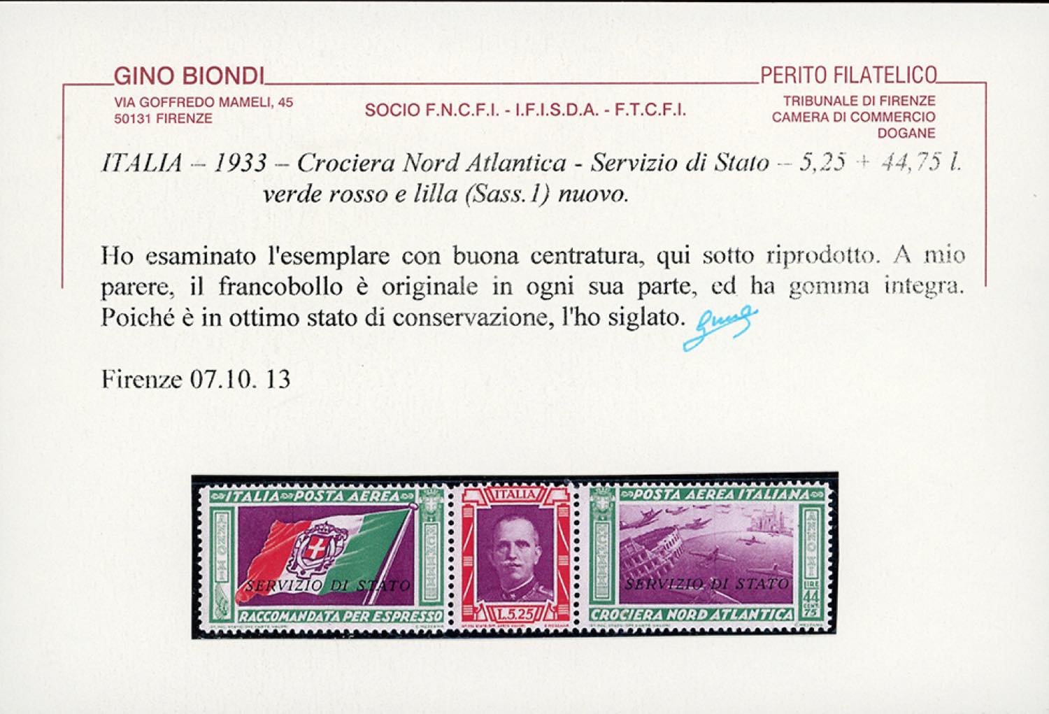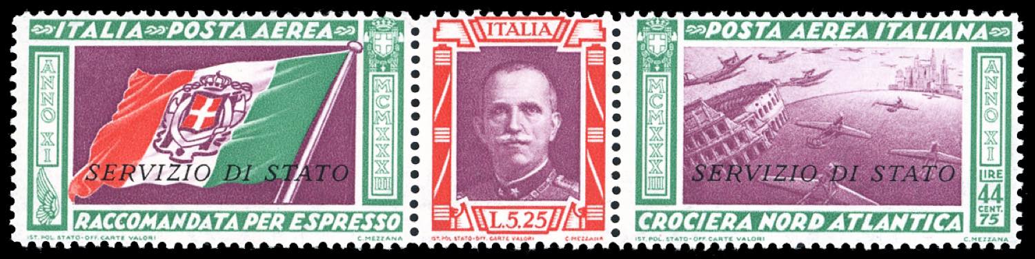 1933 - 5,25 + 44,75 lire trittico Servizio di Stato (1), gomma originale integra, perfetto. Molto fresco.