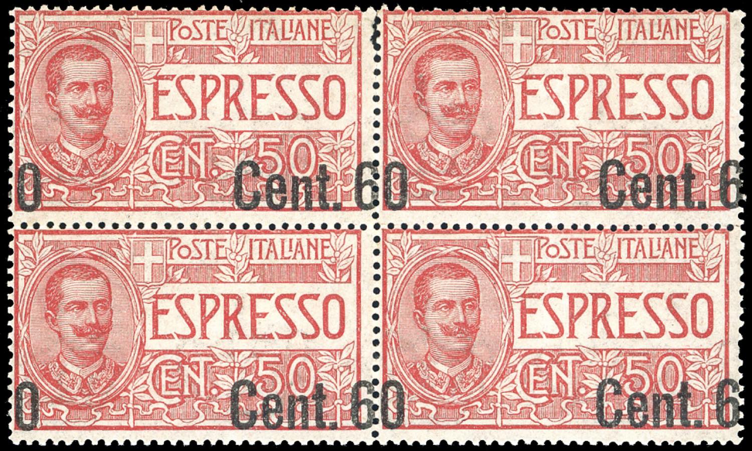 1922 - 60 cent. su 50 cent., soprastampa fortemente spostata a destra "0 Cent.6" (6h), blocco di 4, gomma originale integra, perfetto. Caffaz, Chiavarello.